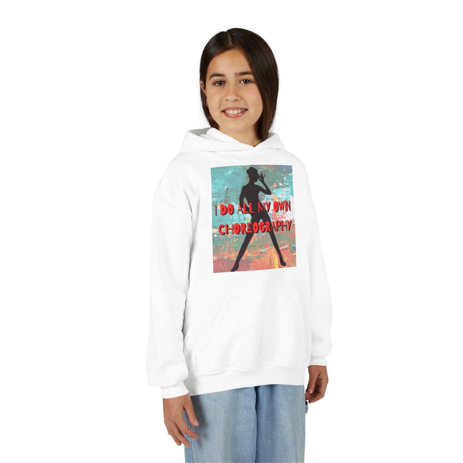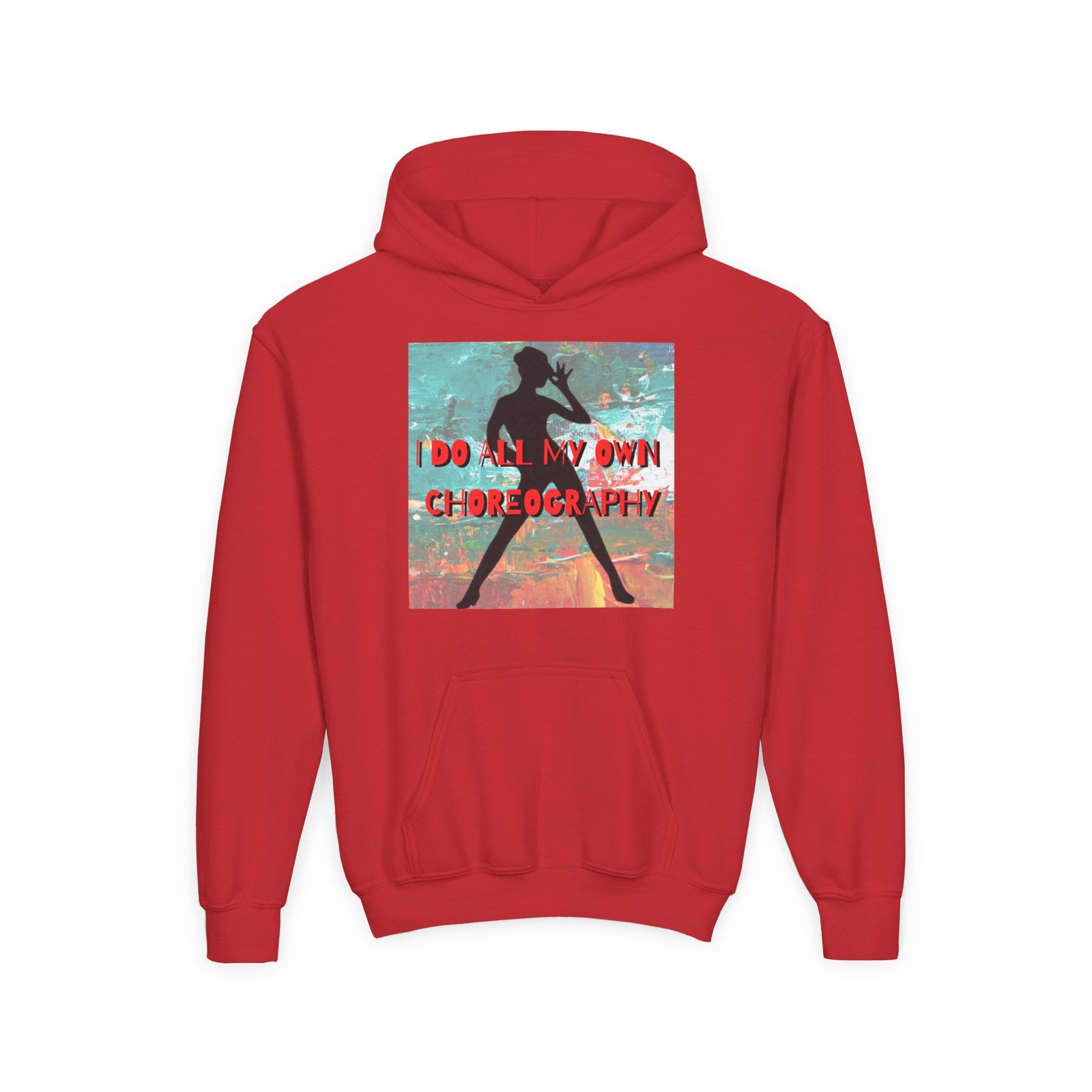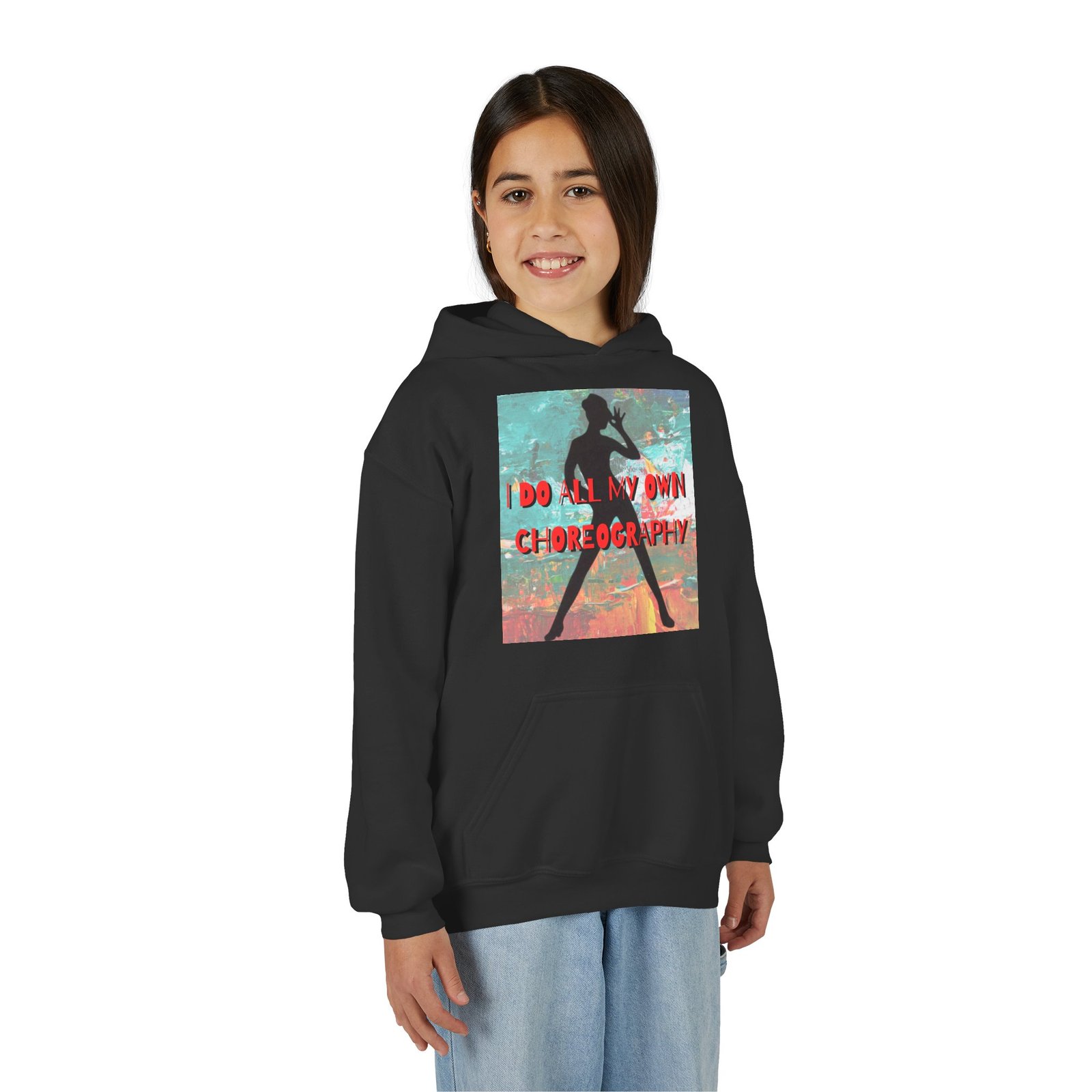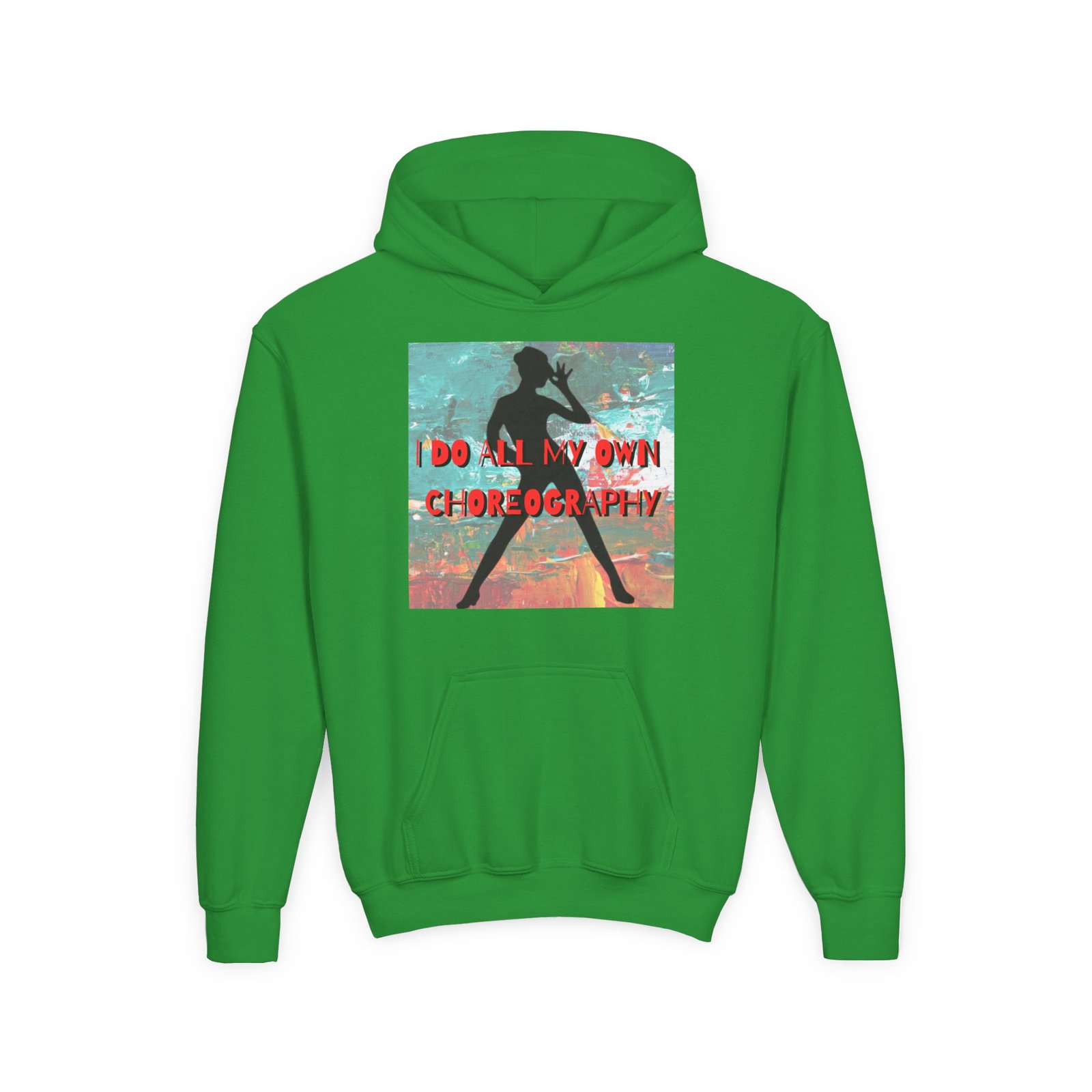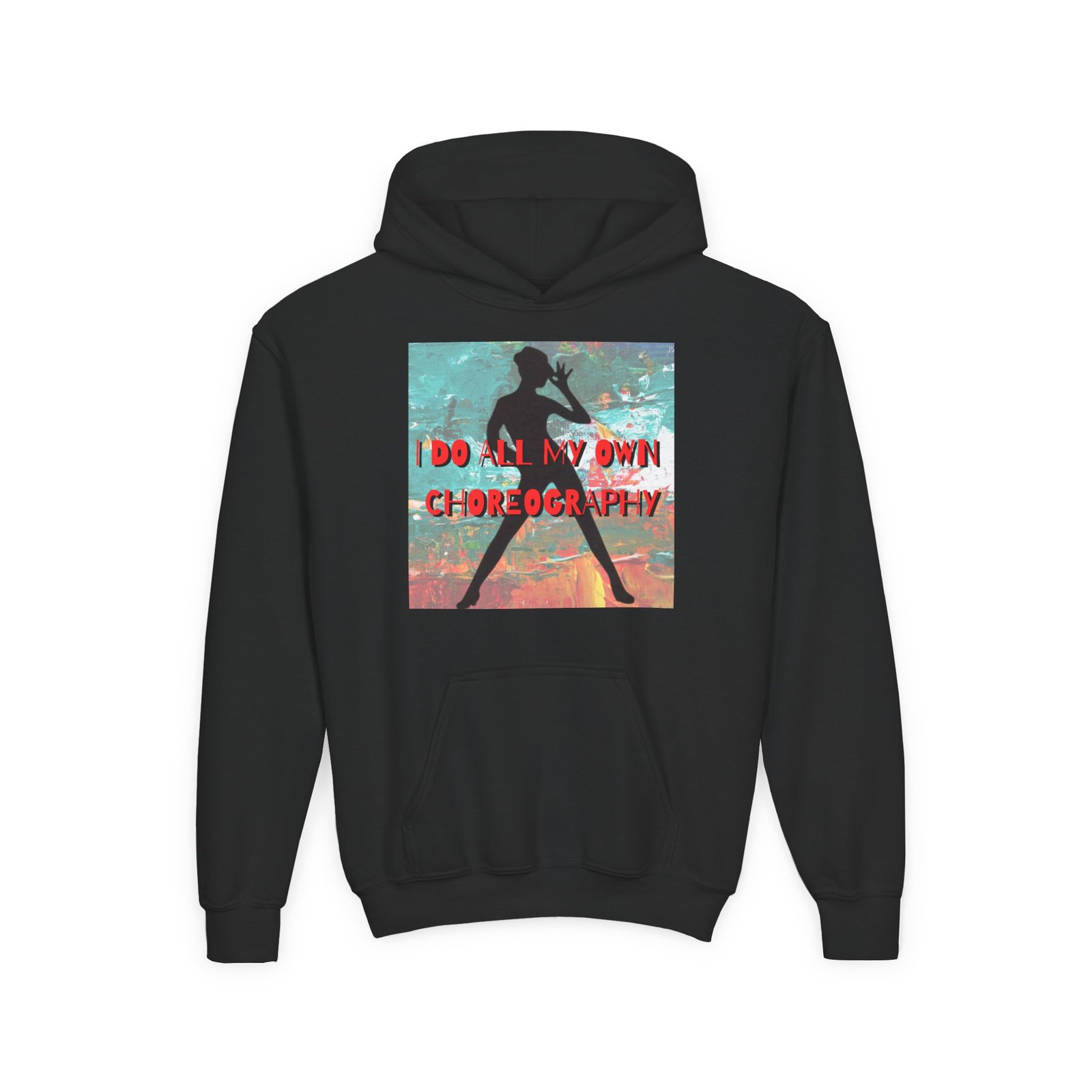 This youth hoodie brings dance-floor attitude to everyday wear. A bold silhouetted dancer strikes a pose against a painterly teal-and-coral background while confident red lettering reads I DO ALL MY OWN CHOREOGRAPHY. Soft, midweight fabric and a roomy kangaroo pocket make this hoodie comfortable for rehearsals, school days, or cool evenings at home. It’s built to move with young performers—sturdy seams, a true-to-size cut, and a smooth surface that keeps the printed art vivid through washes. Let a young dancer wear their spark and swagger with a pullover that feels lived-in from the first stretch.