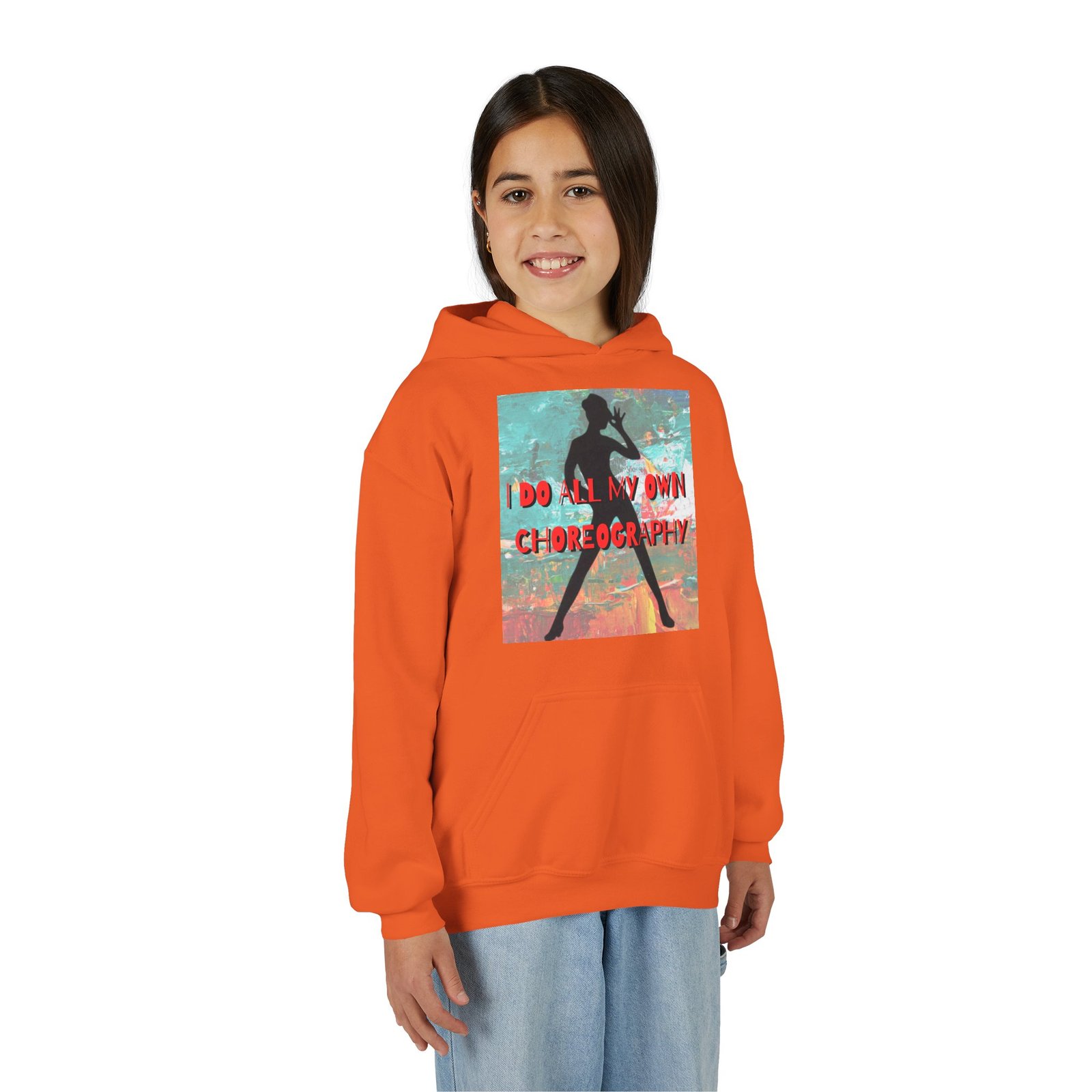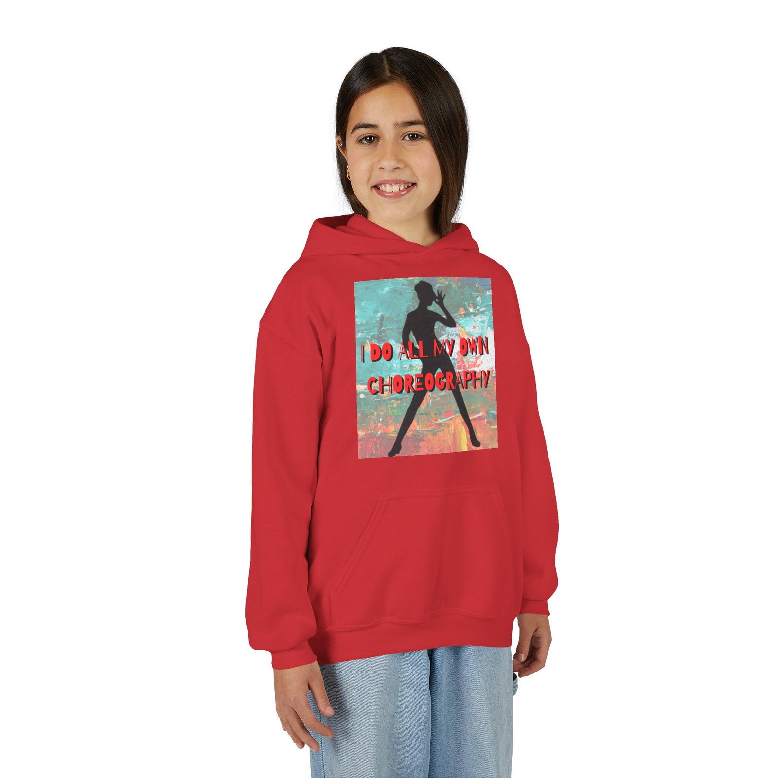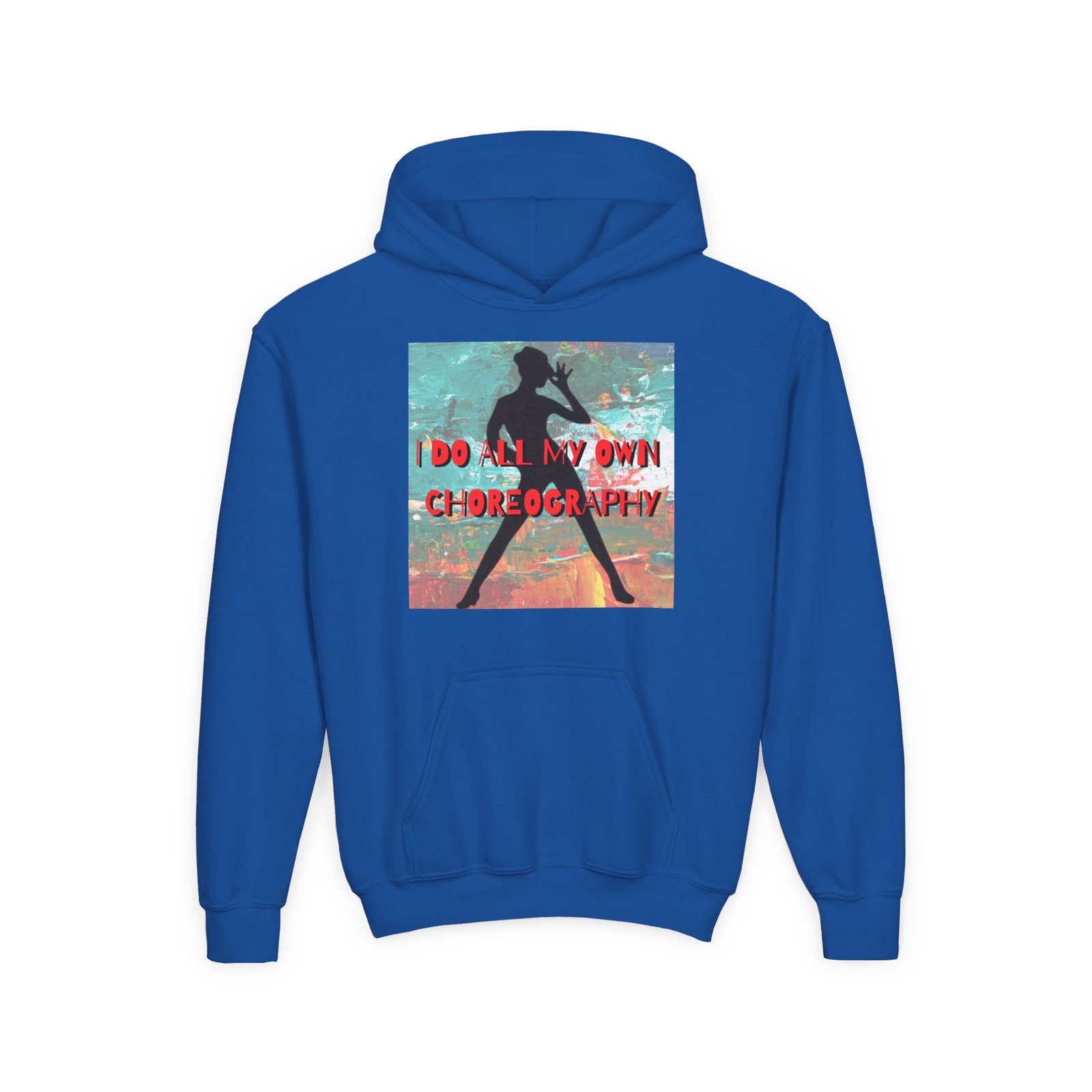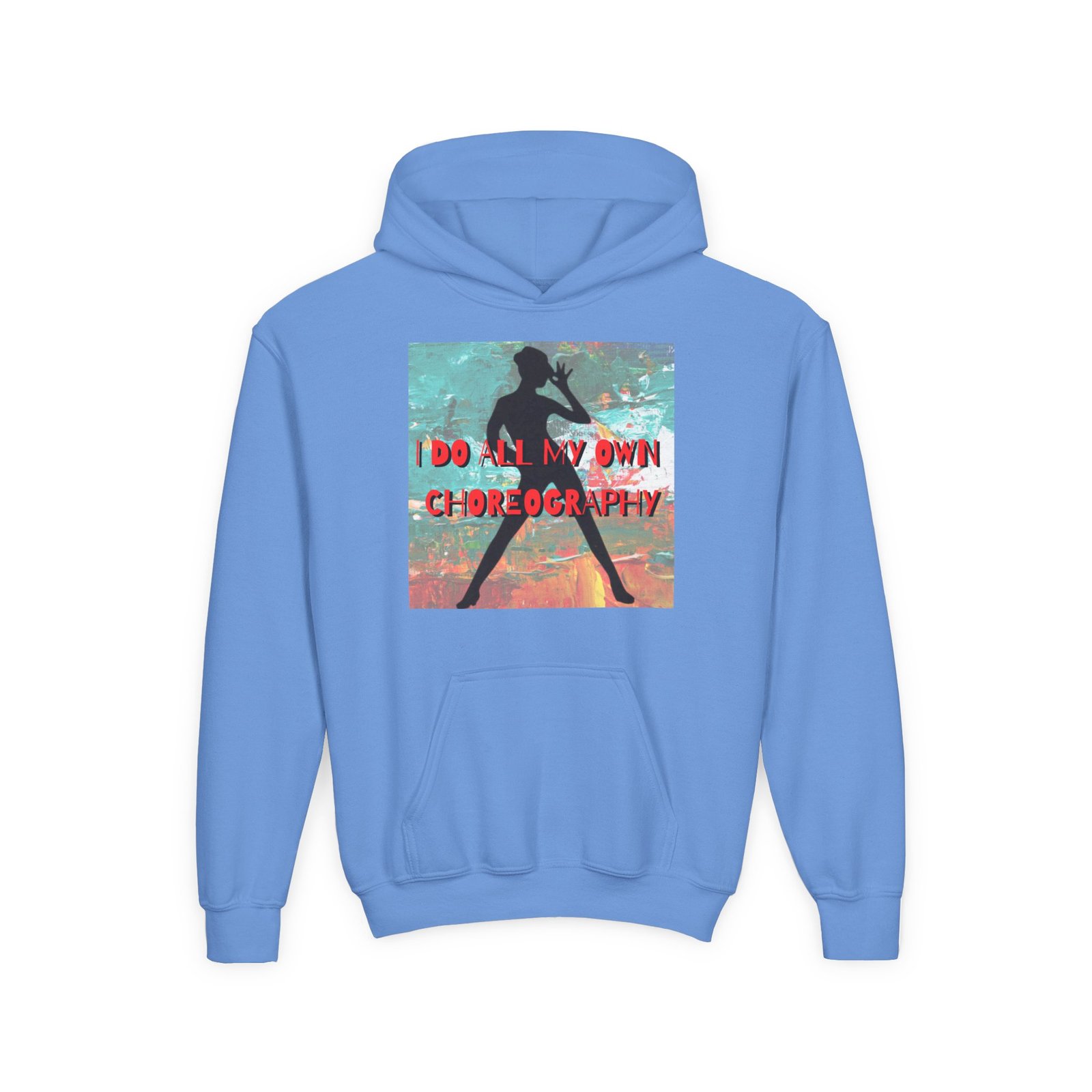 This youth hoodie brings dance-floor attitude to everyday wear. A bold silhouetted dancer strikes a pose against a painterly teal-and-coral background while confident red lettering reads I DO ALL MY OWN CHOREOGRAPHY. Soft, midweight fabric and a roomy kangaroo pocket make this hoodie comfortable for rehearsals, school days, or cool evenings at home. It’s built to move with young performers—sturdy seams, a true-to-size cut, and a smooth surface that keeps the printed art vivid through washes. Let a young dancer wear their spark and swagger with a pullover that feels lived-in from the first stretch.