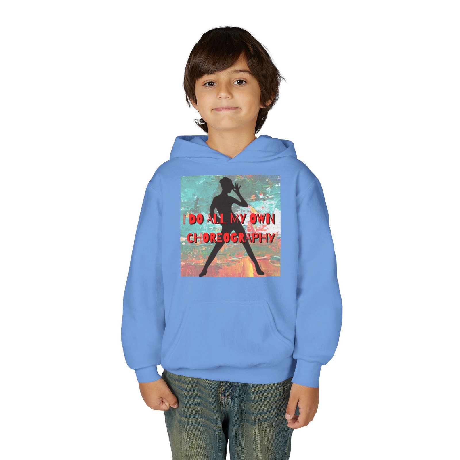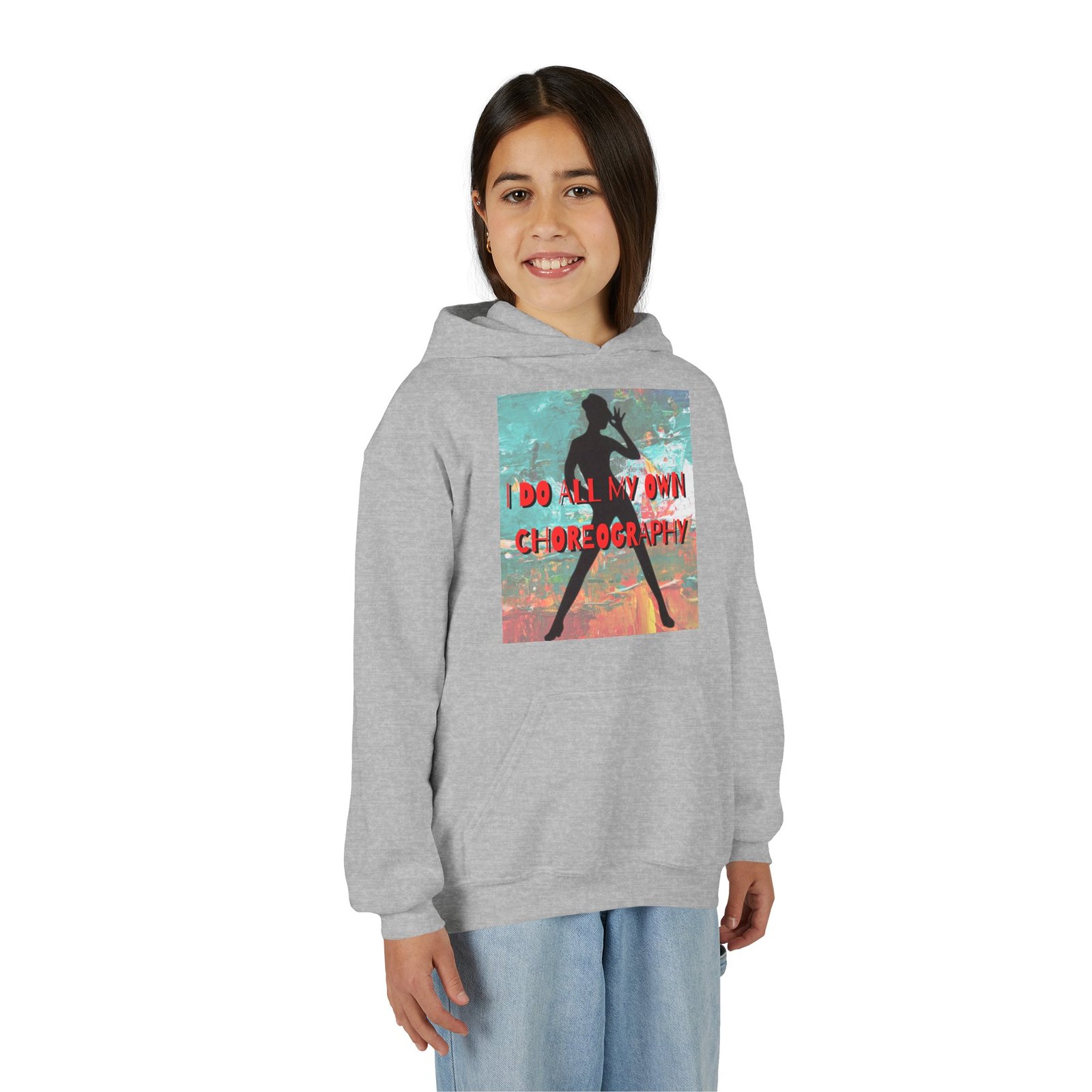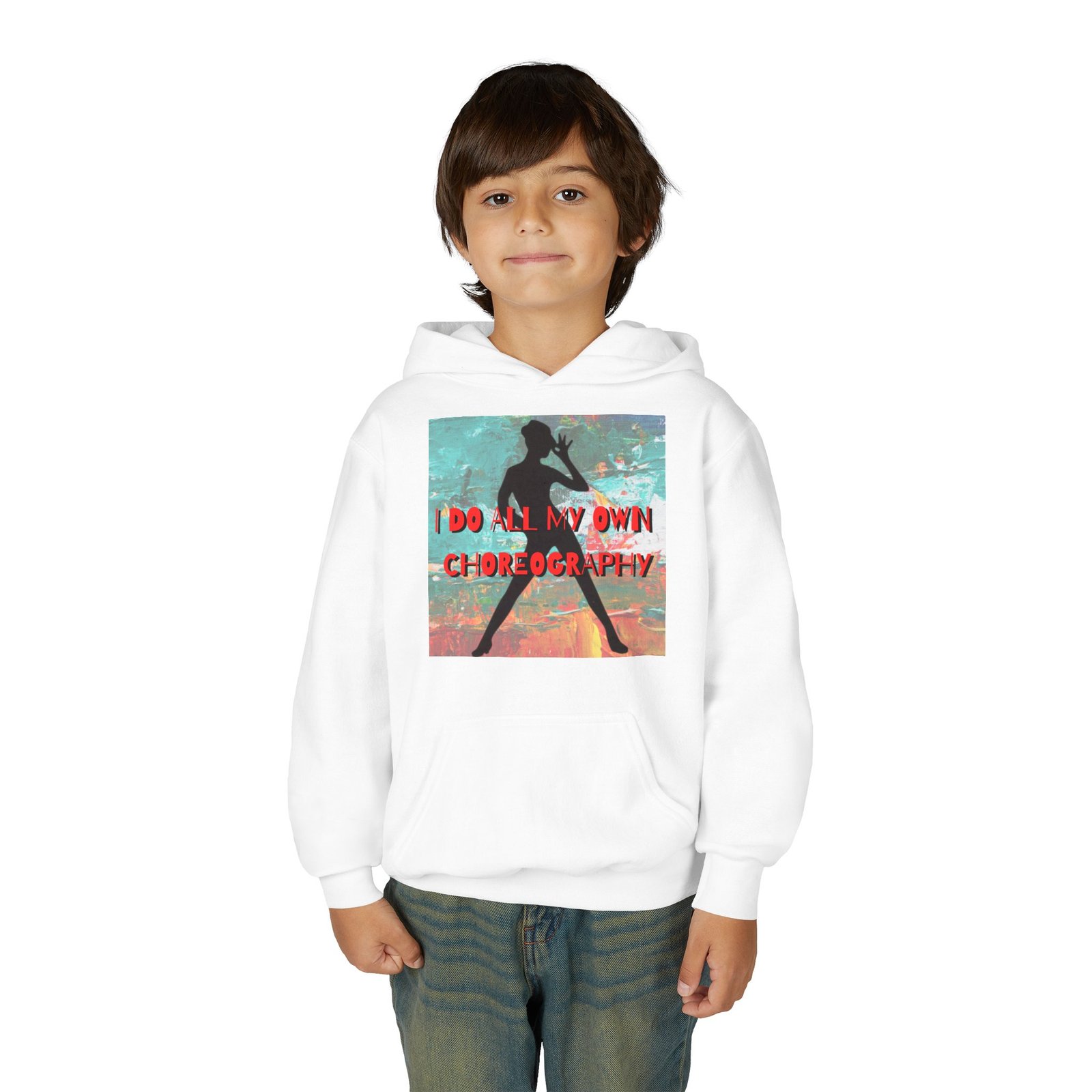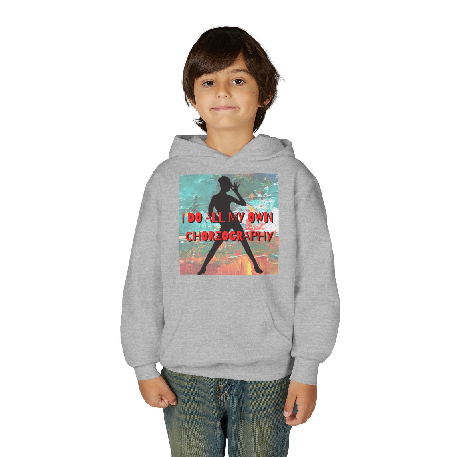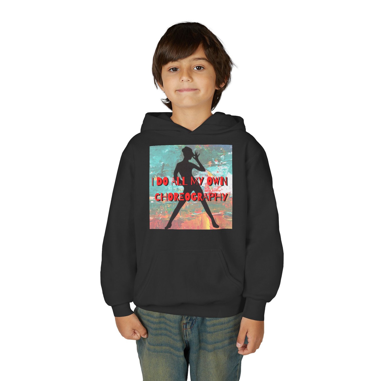 This youth hoodie brings dance-floor attitude to everyday wear. A bold silhouetted dancer strikes a pose against a painterly teal-and-coral background while confident red lettering reads I DO ALL MY OWN CHOREOGRAPHY. Soft, midweight fabric and a roomy kangaroo pocket make this hoodie comfortable for rehearsals, school days, or cool evenings at home. It’s built to move with young performers—sturdy seams, a true-to-size cut, and a smooth surface that keeps the printed art vivid through washes. Let a young dancer wear their spark and swagger with a pullover that feels lived-in from the first stretch.