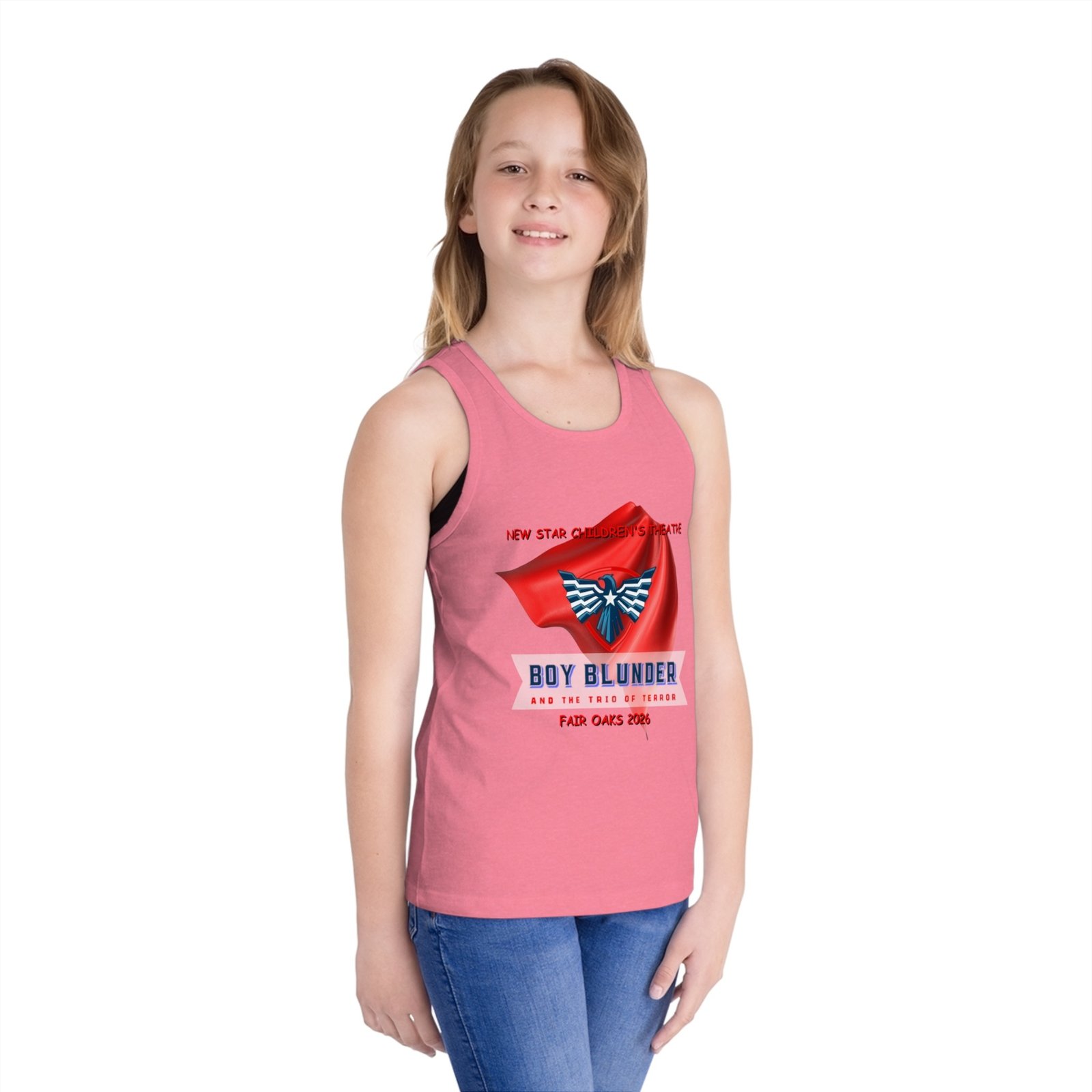 Offering the Kid’s Jersey Tank Top – Boy Blunder and the Trio of Terror Red Cape Kids Superhero Graphic as a gift is a thrilling choice.