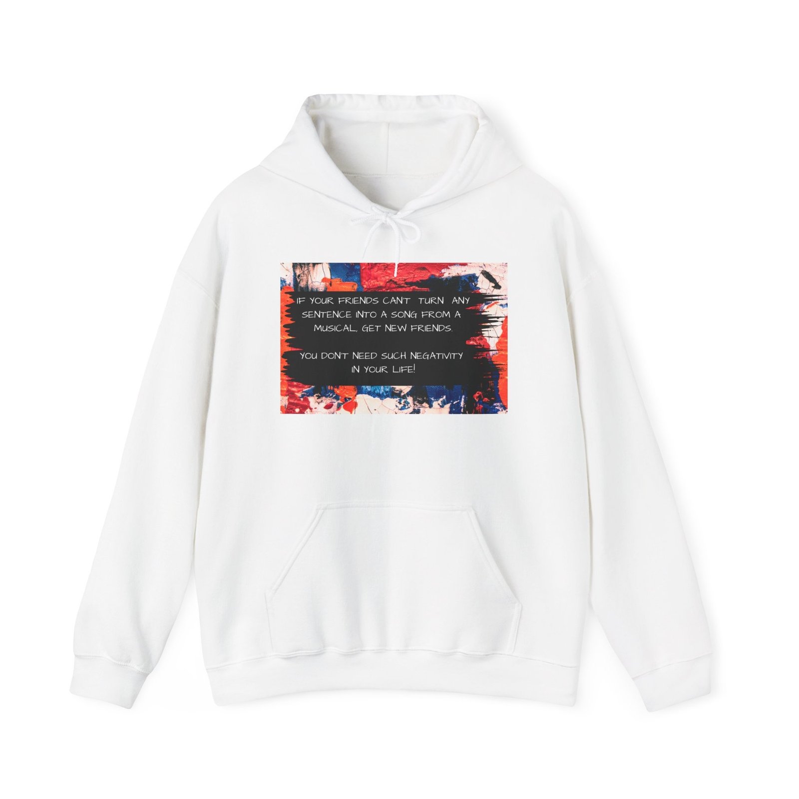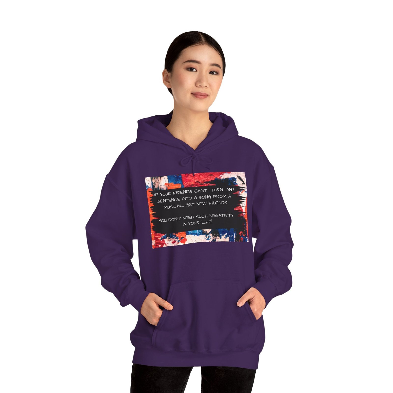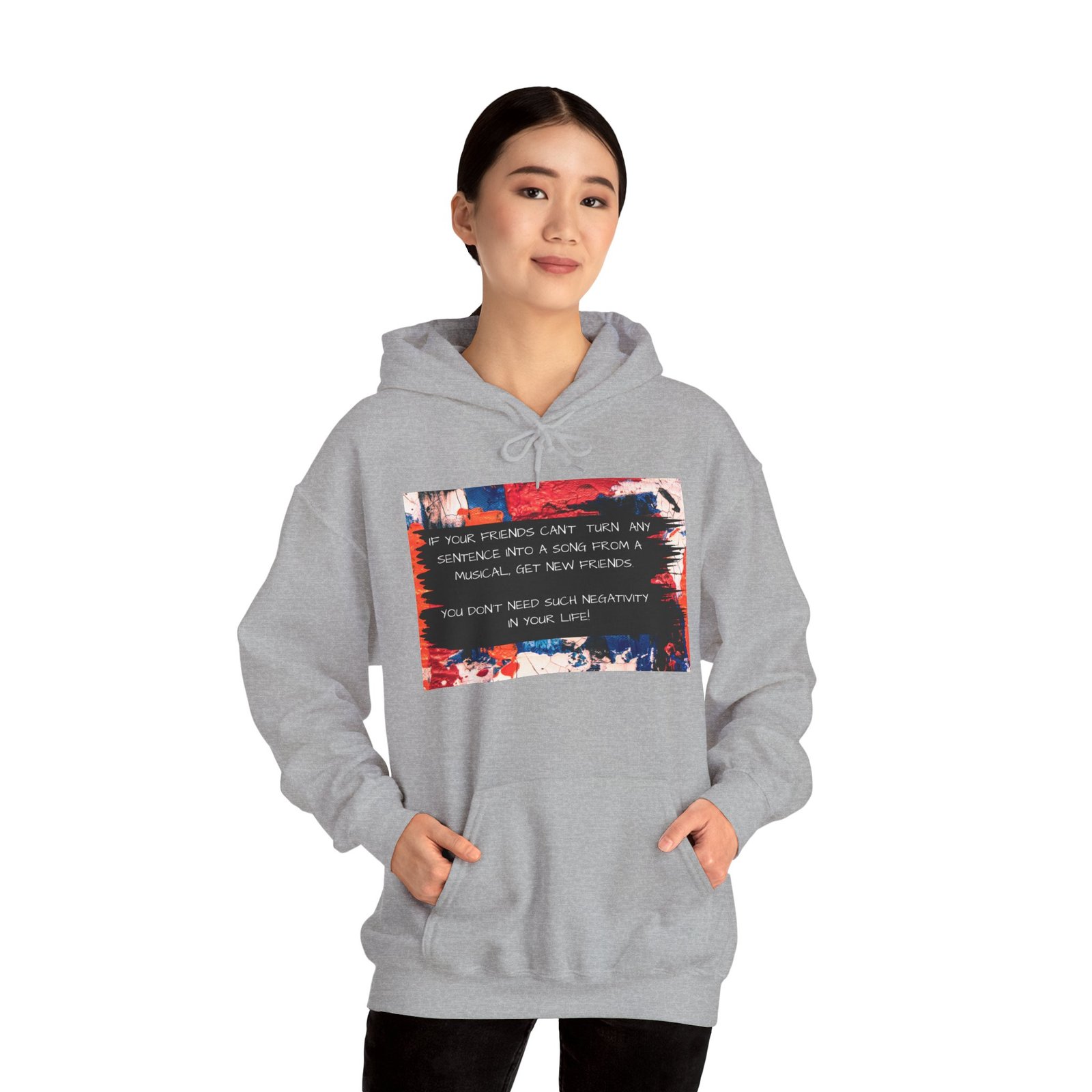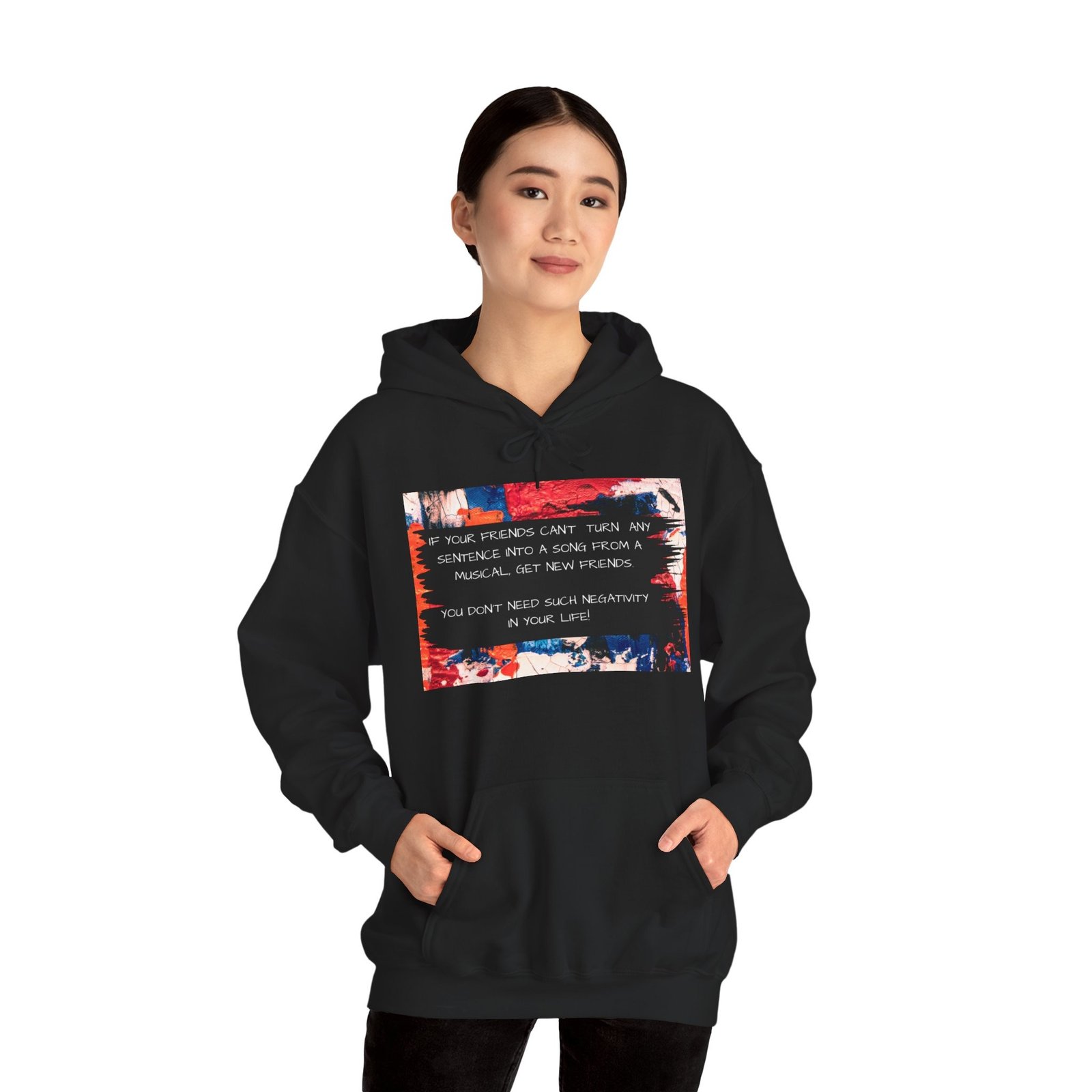 Looking for style and a Broadway-inspired sweatshirt? This Adult Musical Friends Quote Hoodie — “Get New Friends” Broadway Humor Sweatshirt fits the bill due to its comfort and eye-catching design, available in a variety of sizes, and stands out effortlessly.