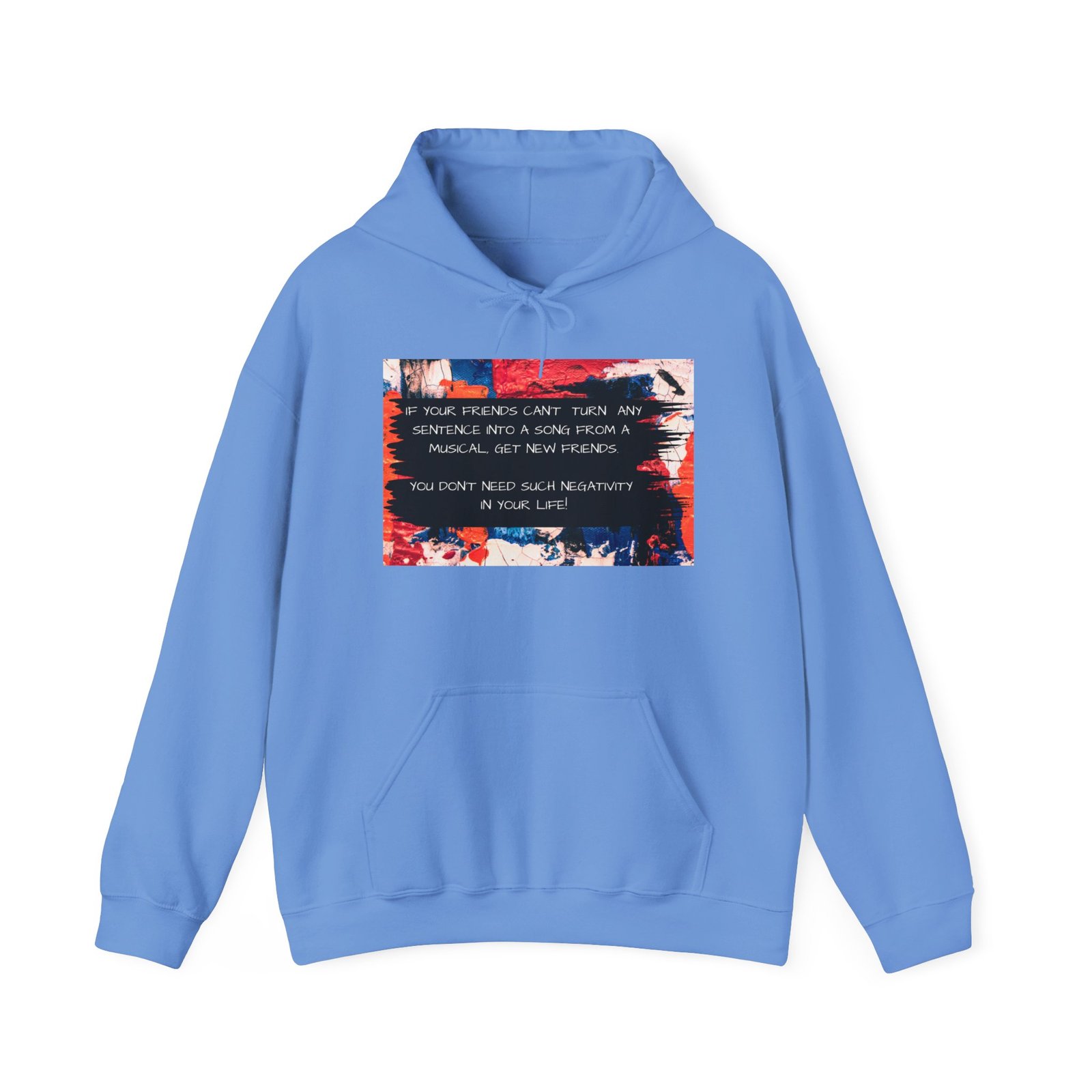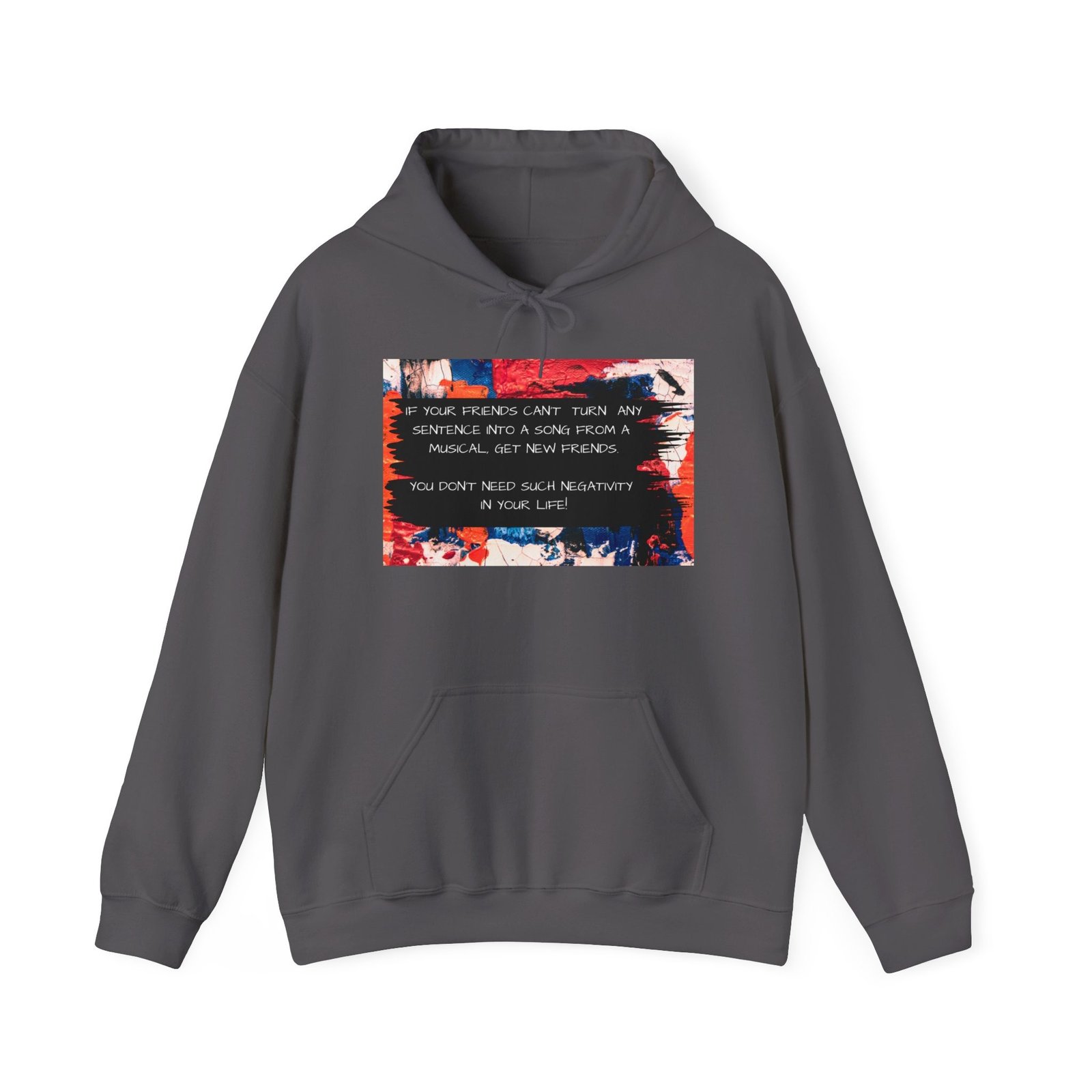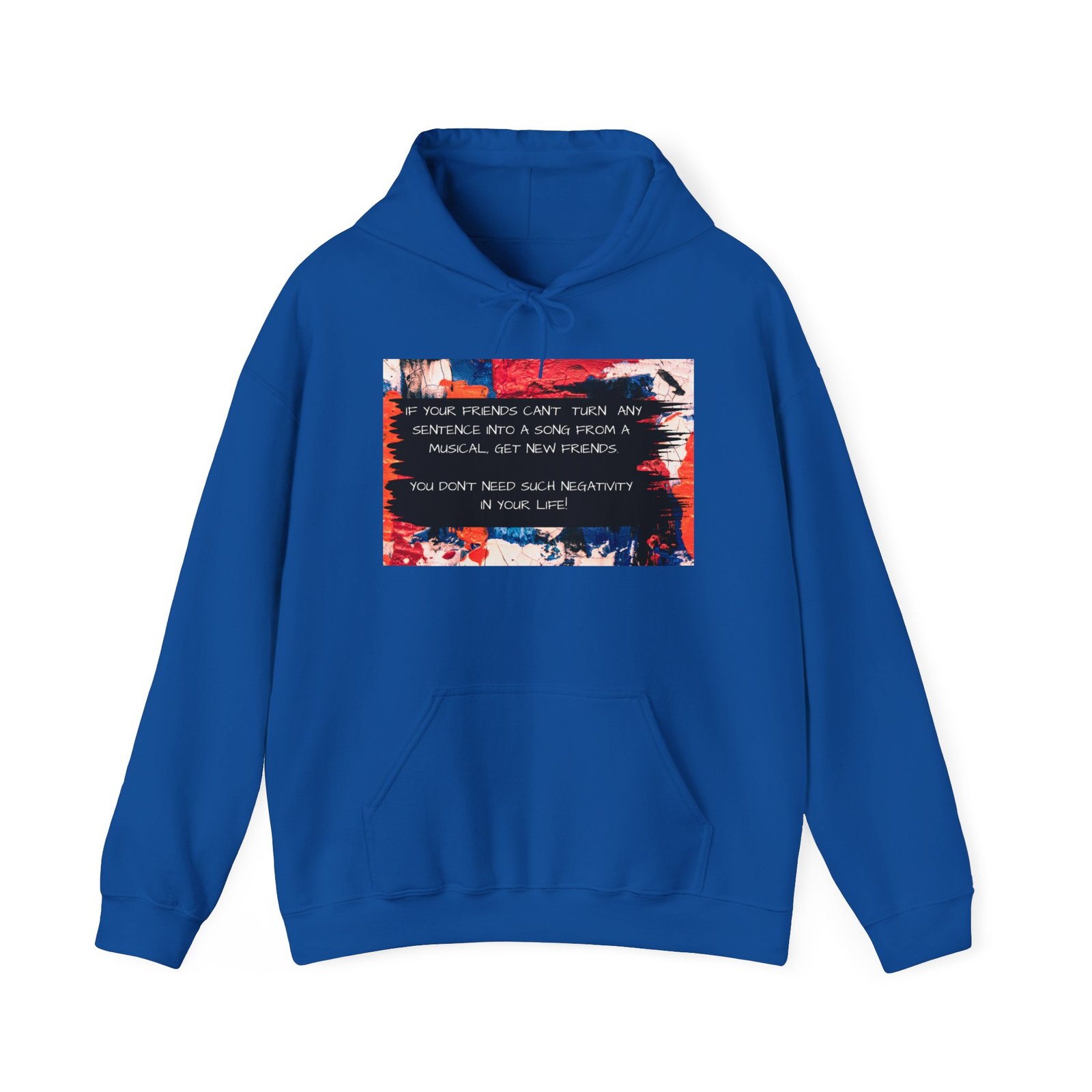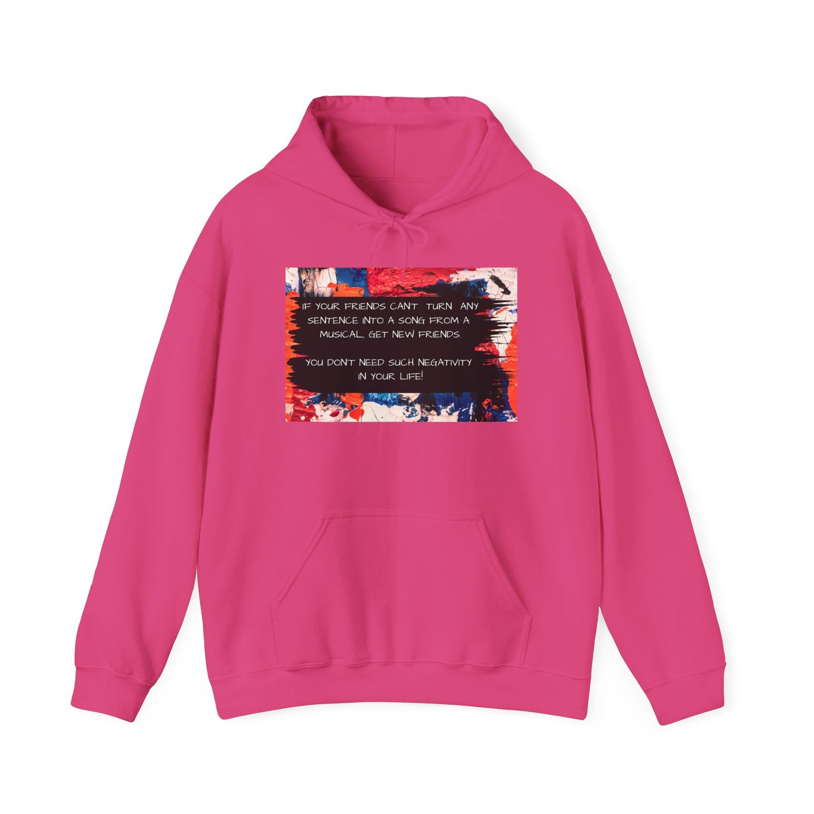 Looking for style and a Broadway-inspired sweatshirt? This Adult Musical Friends Quote Hoodie — “Get New Friends” Broadway Humor Sweatshirt fits the bill due to its comfort and eye-catching design, available in a variety of sizes, and stands out effortlessly.