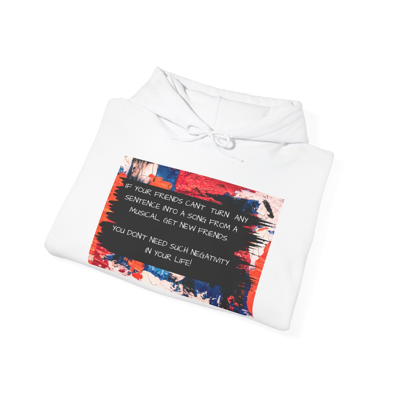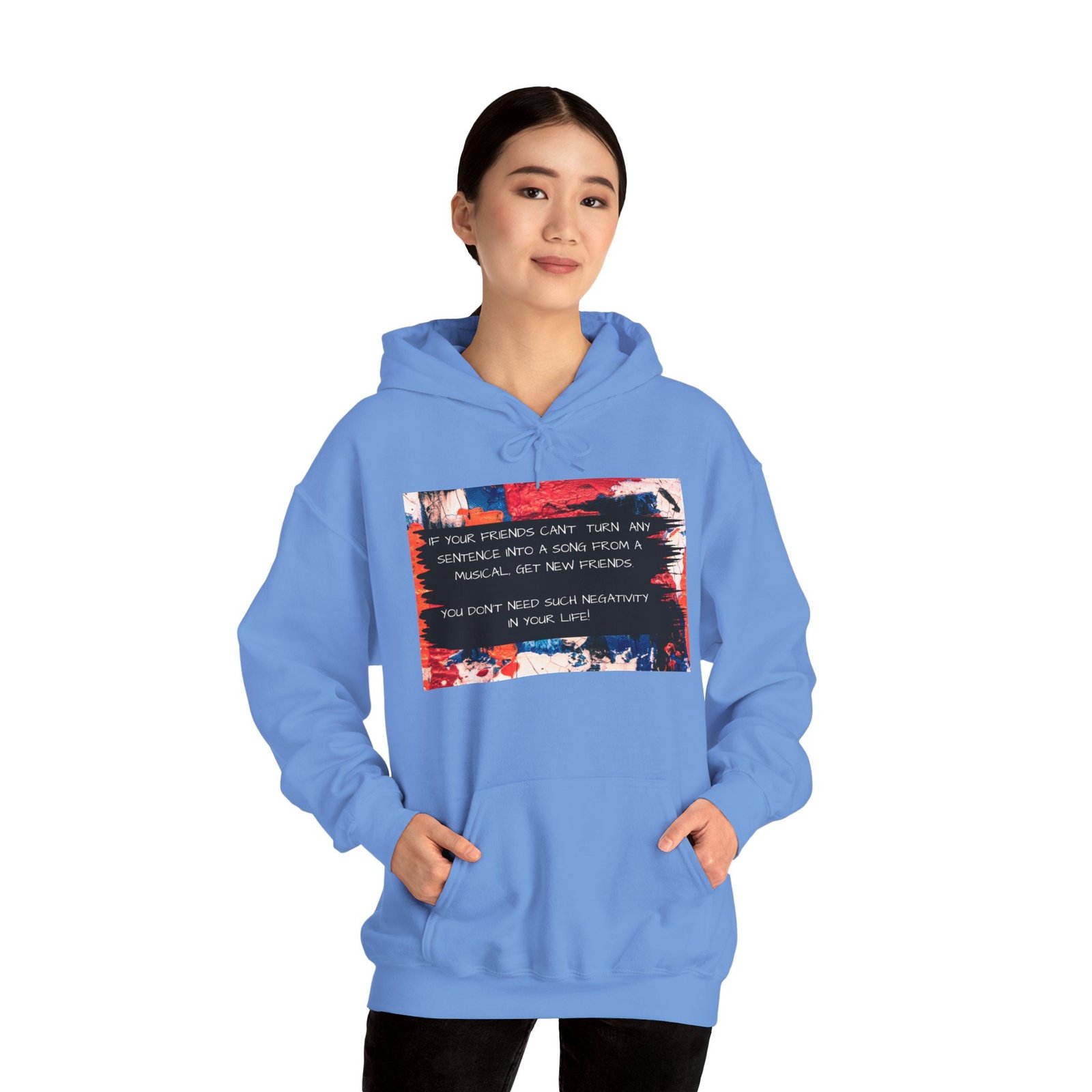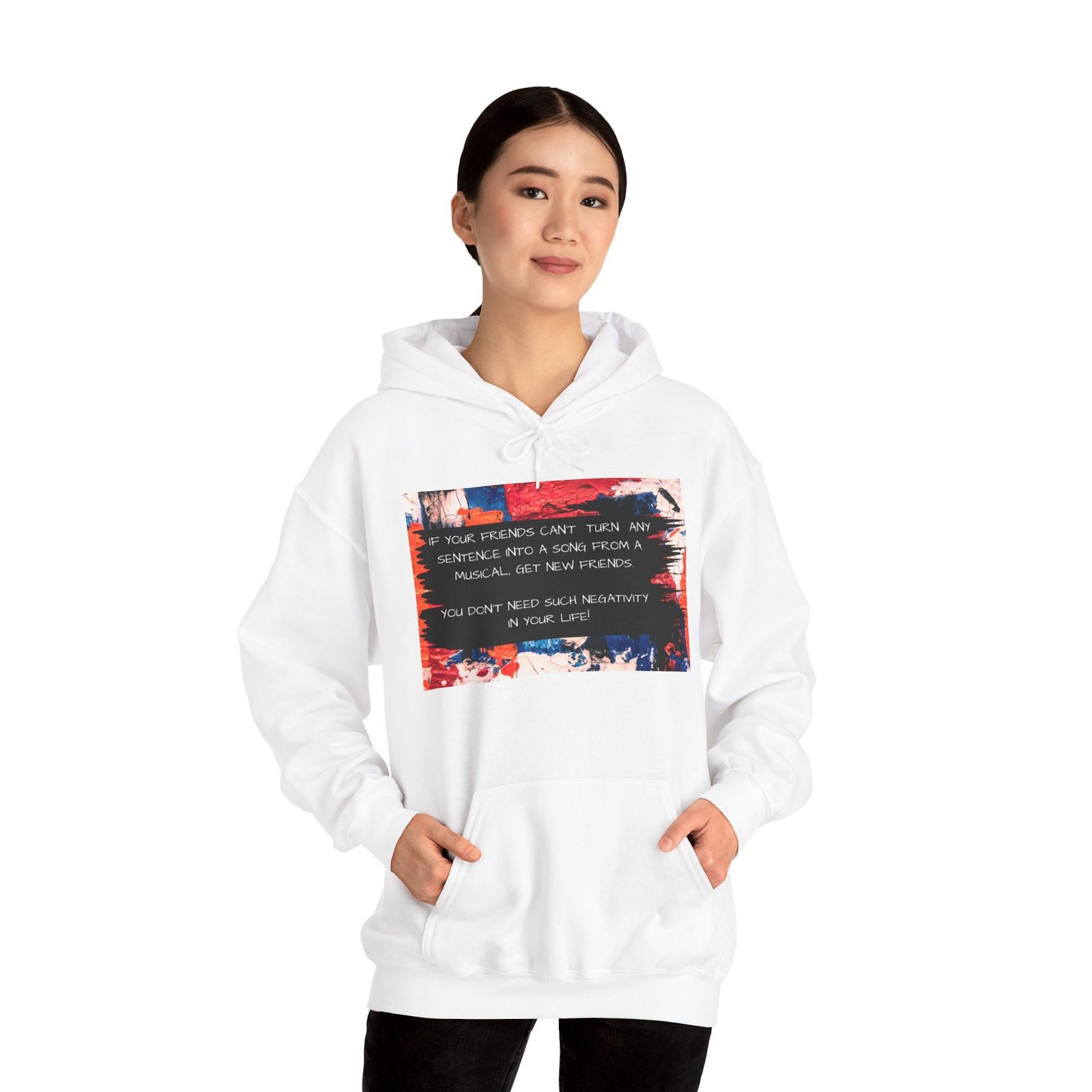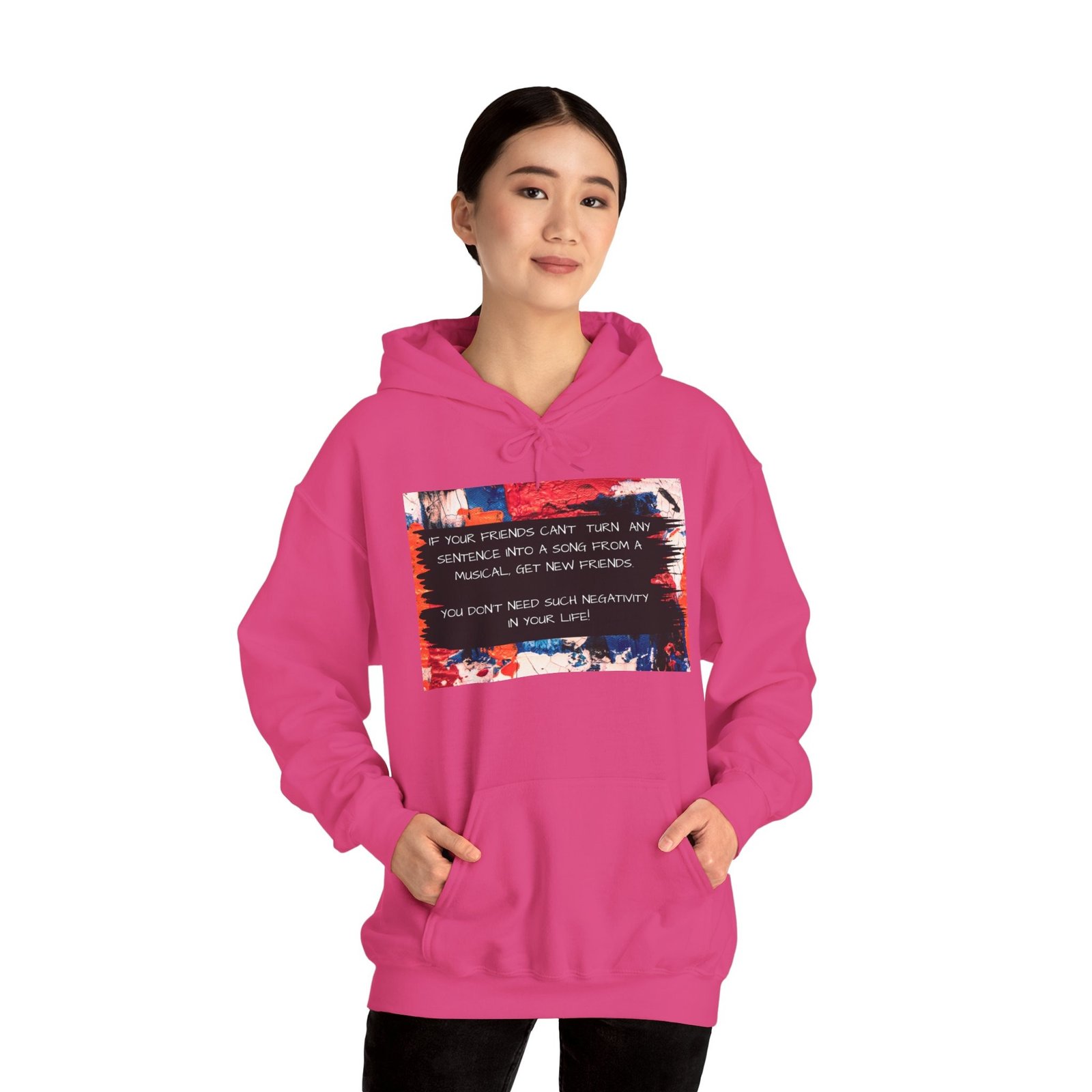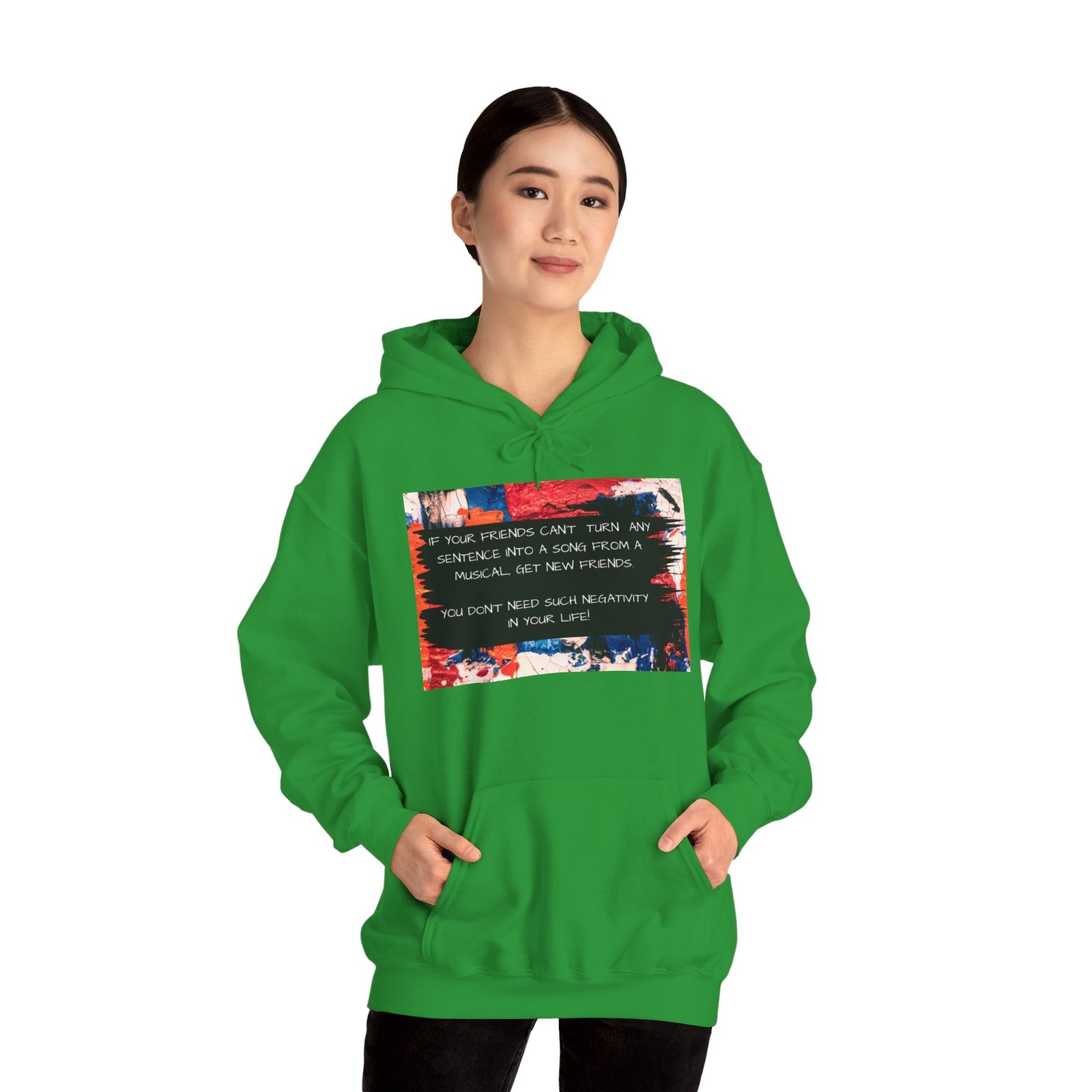 Looking for style and a Broadway-inspired sweatshirt? This Adult Musical Friends Quote Hoodie — “Get New Friends” Broadway Humor Sweatshirt fits the bill due to its comfort and eye-catching design, available in a variety of sizes, and stands out effortlessly.