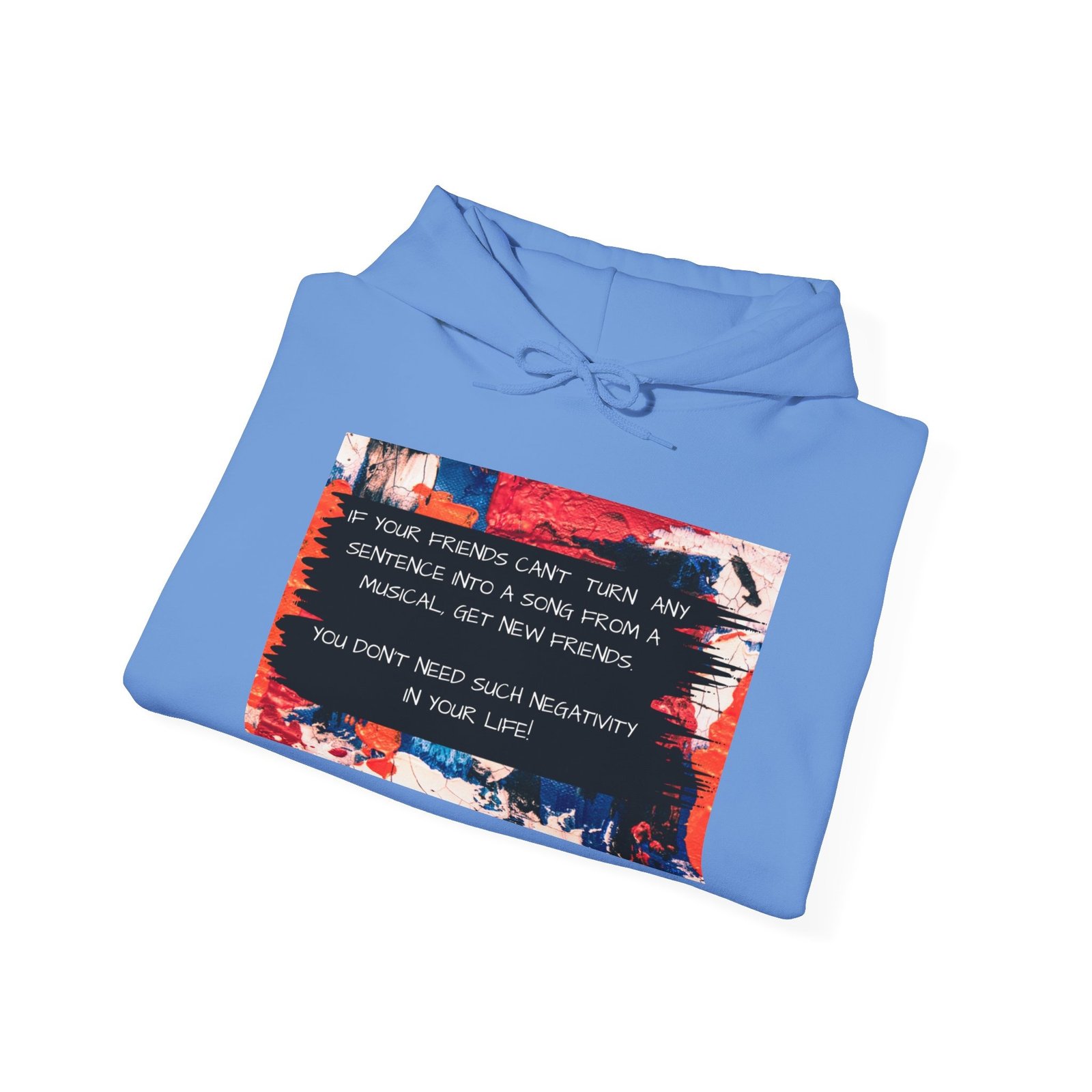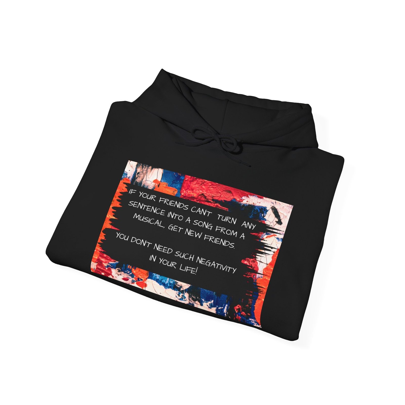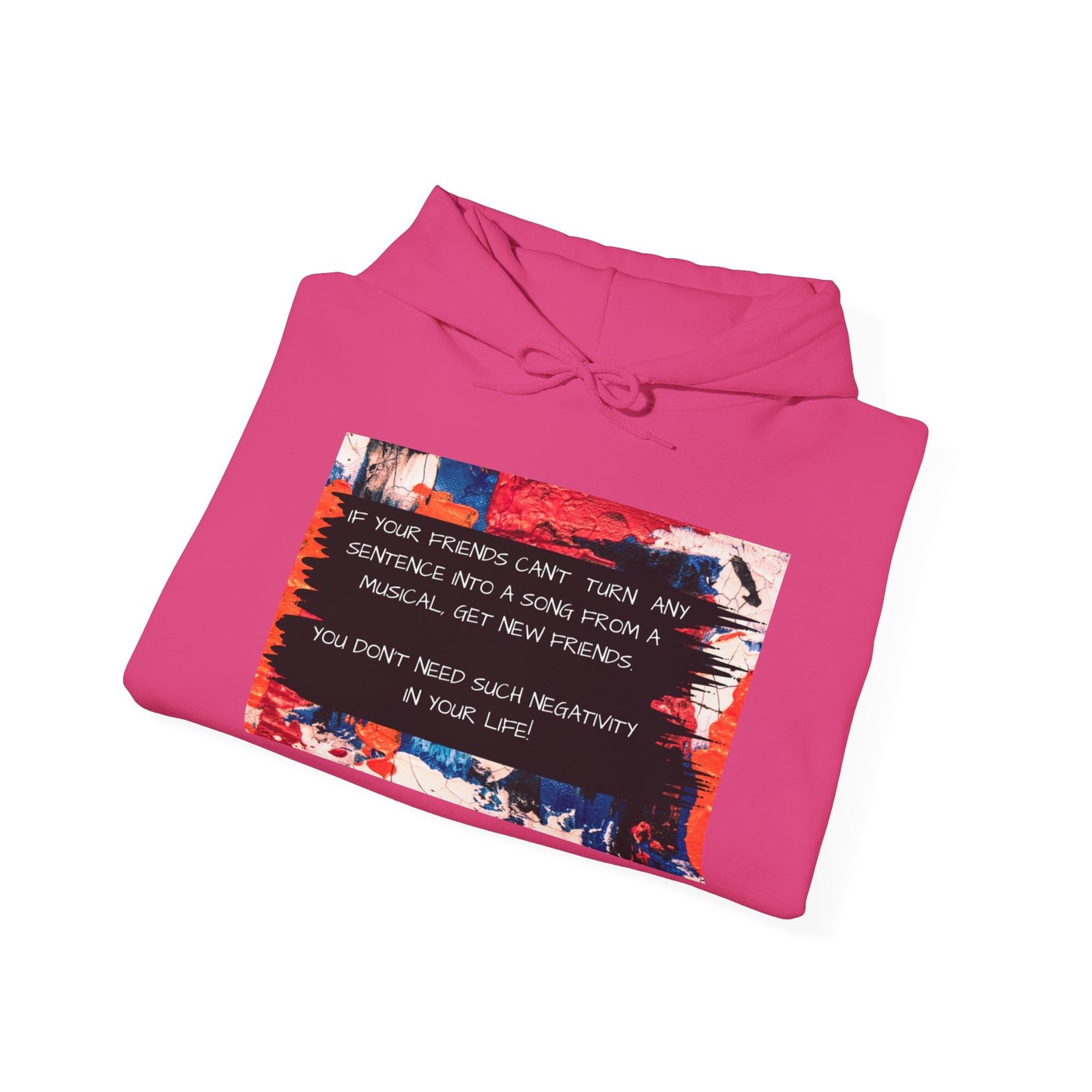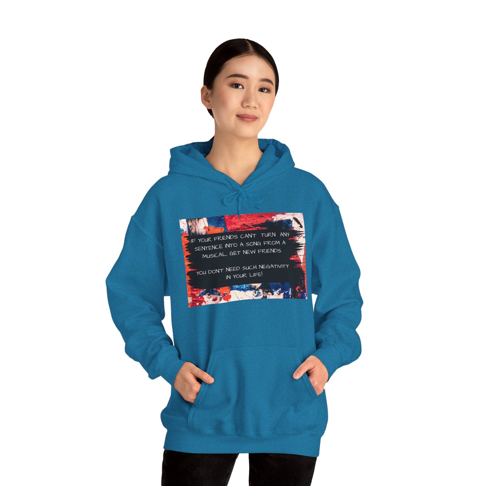 Looking for style and a Broadway-inspired sweatshirt? This Adult Musical Friends Quote Hoodie — “Get New Friends” Broadway Humor Sweatshirt fits the bill due to its comfort and eye-catching design, available in a variety of sizes, and stands out effortlessly.
