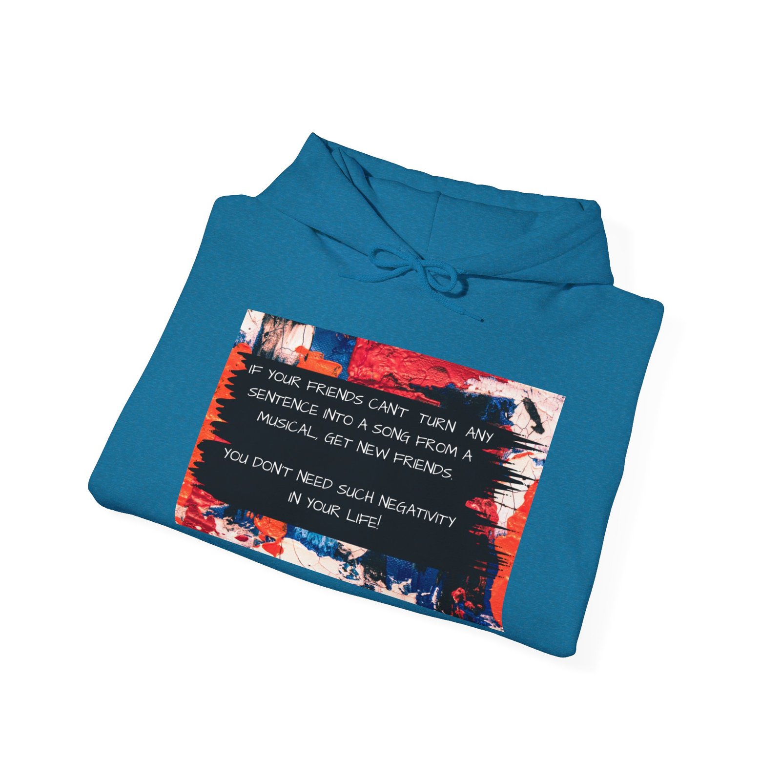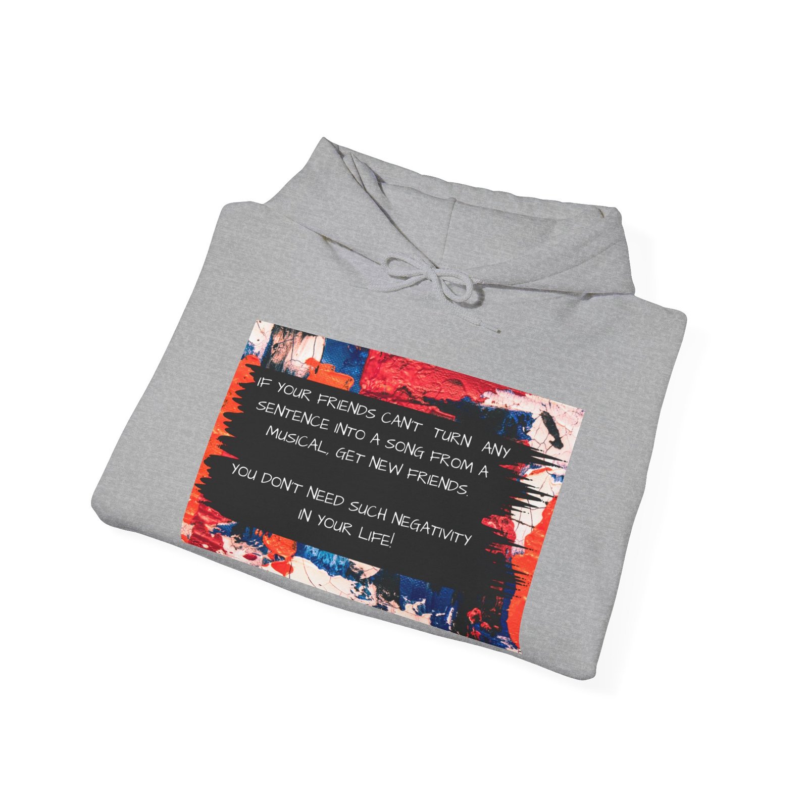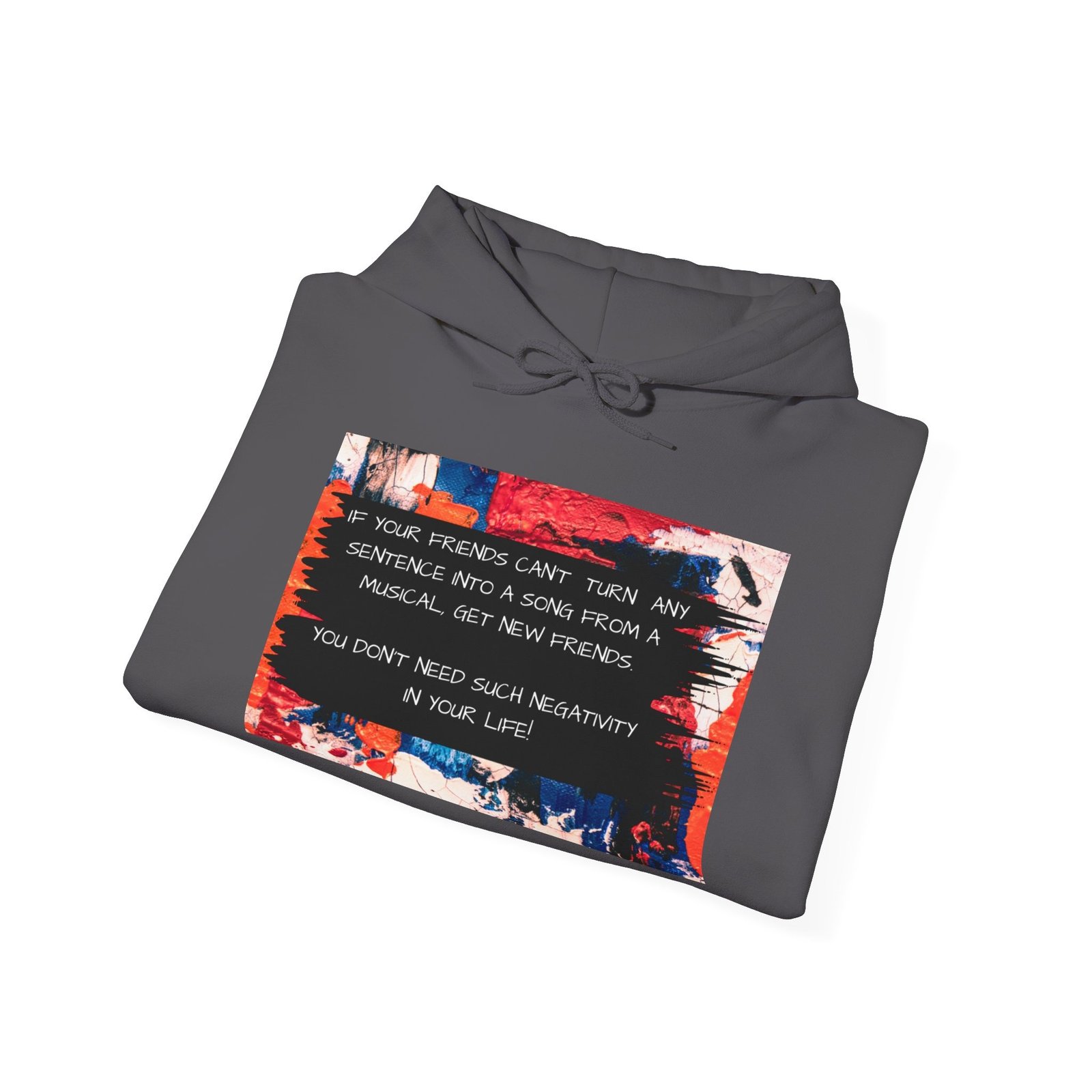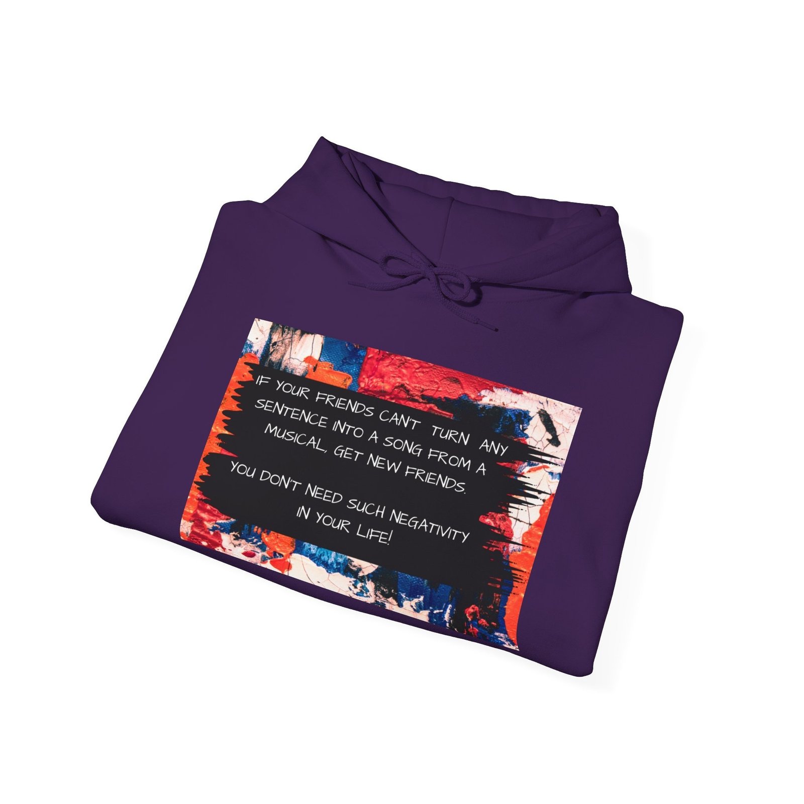 Looking for style and a Broadway-inspired sweatshirt? This Adult Musical Friends Quote Hoodie — “Get New Friends” Broadway Humor Sweatshirt fits the bill due to its comfort and eye-catching design, available in a variety of sizes, and stands out effortlessly.