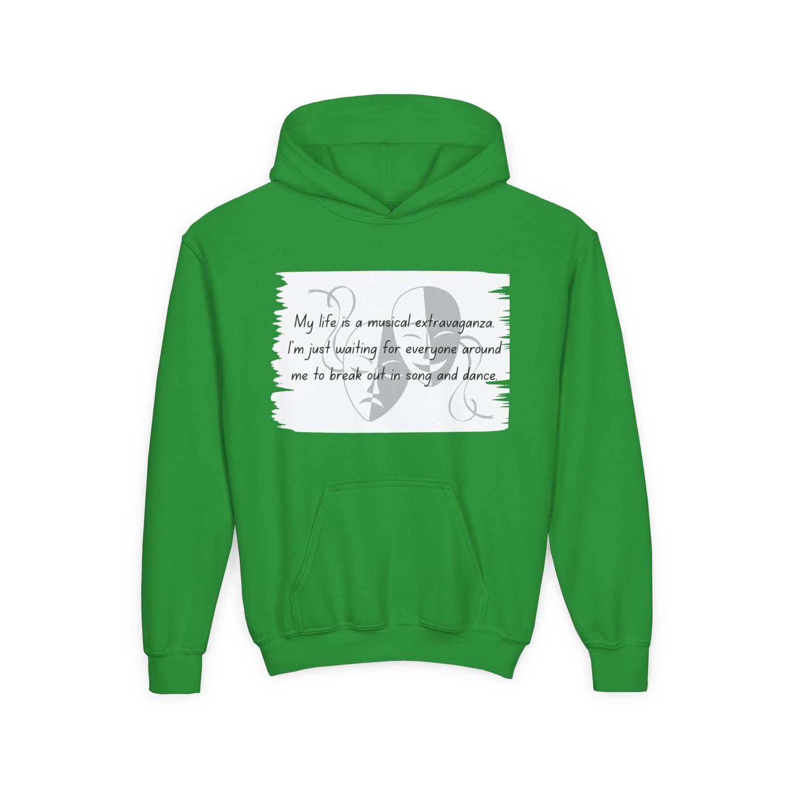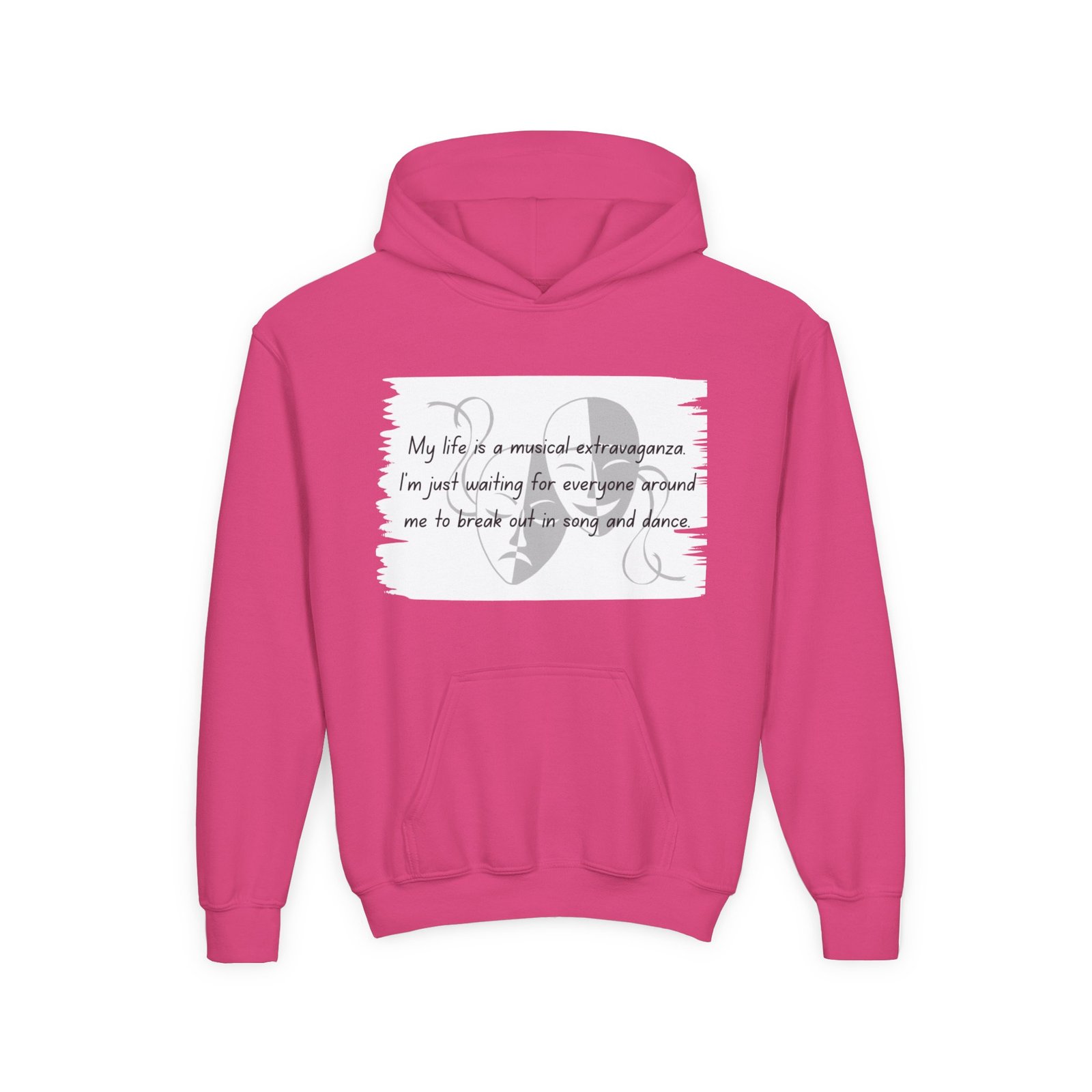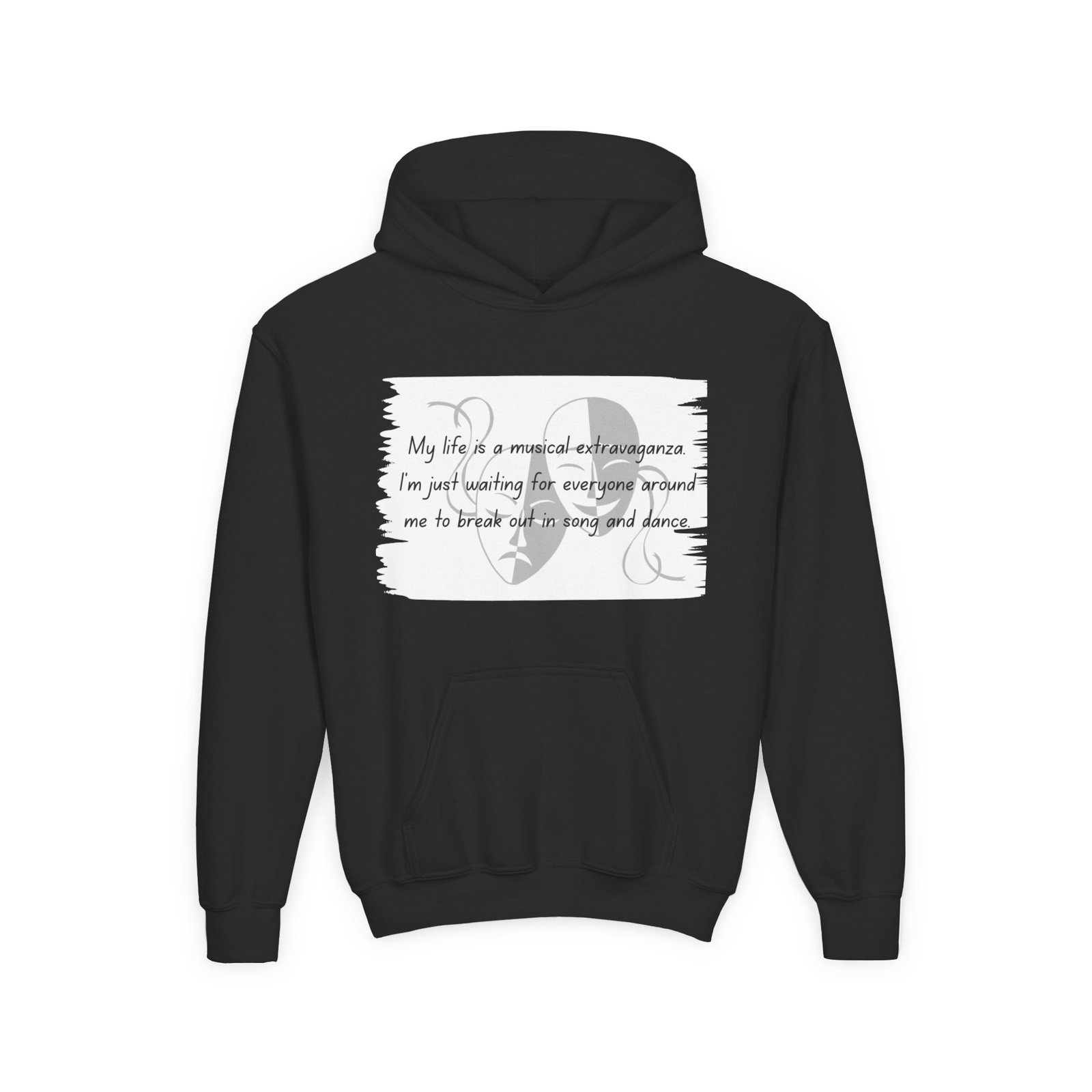 Elevate your wardrobe with this delightful Youth Hoodie that proudly proclaims, “My Life Is a Musical Extravaganza.” Designed for fans of musicals and theatre enthusiasts alike, this Youth Hoodie — Musical Theatre Sweatshirt — “My Life Is a Musical Extravaganza” Funny Quote piece offers the perfect way to showcase your love for the stage. It brings a smile to those who share your passion for music and storytelling with a funny quote. It’s a true musical theatre extravaganza statement. This piece is ideal for any young fan's collection, echoing the humor and style found in a Youth Hoodie. It features the funny quote: "My Life Is a Musical Extravaganza.”