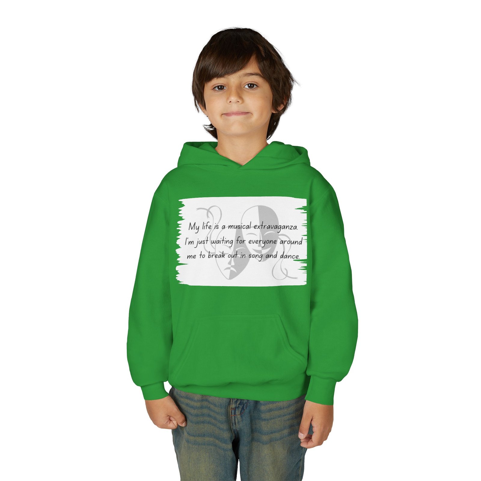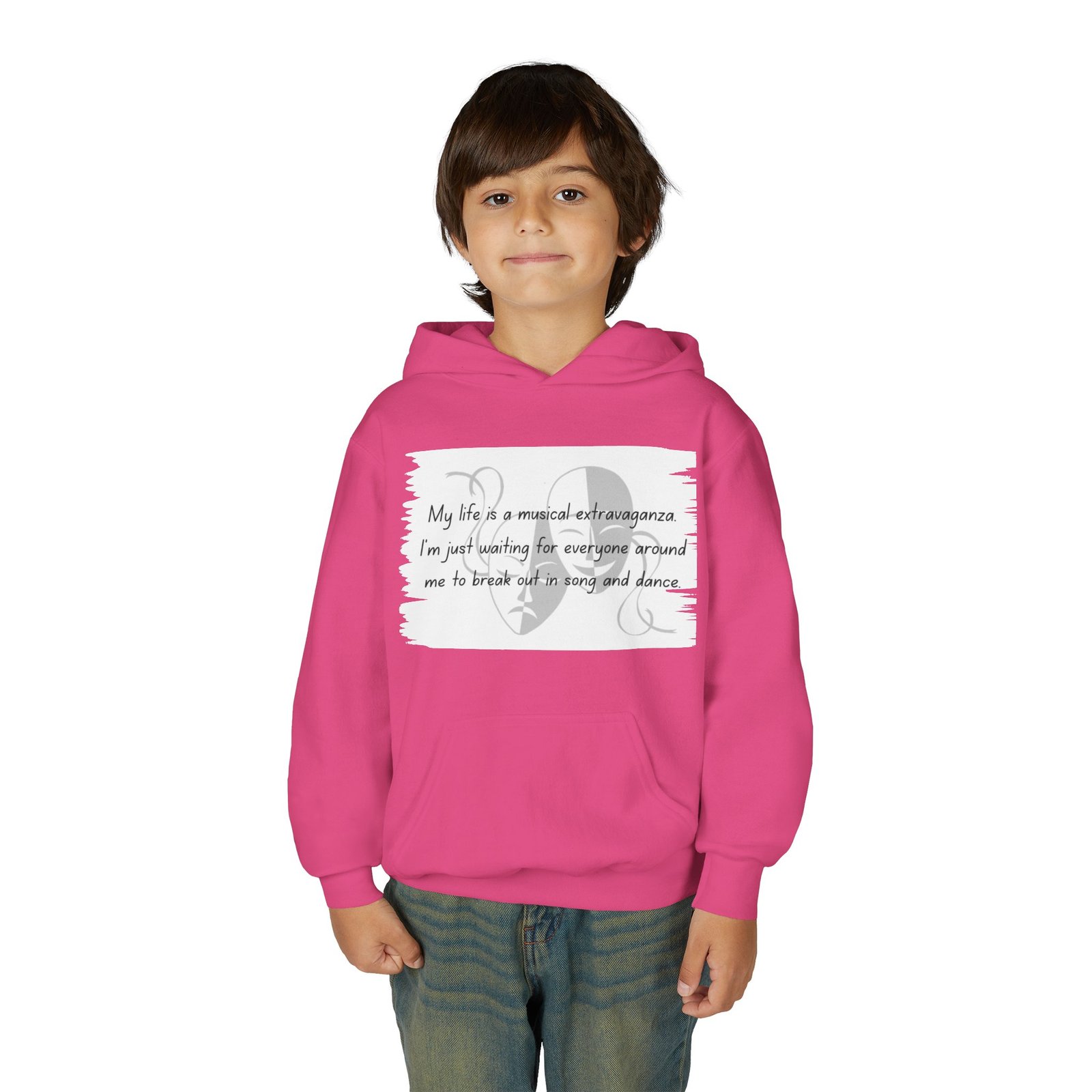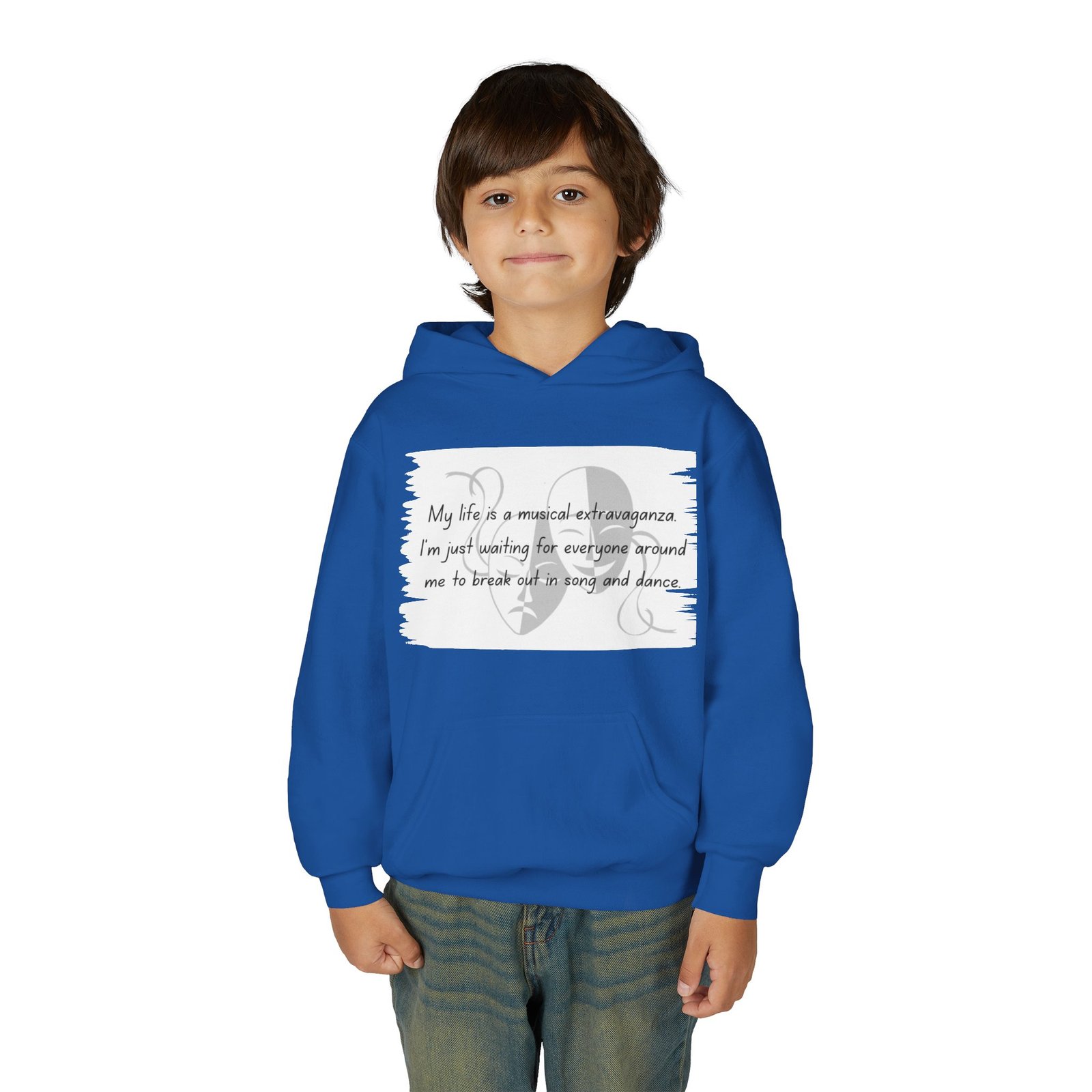Elevate your wardrobe with this delightful Youth Hoodie that proudly proclaims, “My Life Is a Musical Extravaganza.” Designed for fans of musicals and theatre enthusiasts alike, this Youth Hoodie — Musical Theatre Sweatshirt — “My Life Is a Musical Extravaganza” Funny Quote piece offers the perfect way to showcase your love for the stage. It brings a smile to those who share your passion for music and storytelling with a funny quote. It’s a true musical theatre extravaganza statement. This piece is ideal for any young fan's collection, echoing the humor and style found in a Youth Hoodie. It features the funny quote: "My Life Is a Musical Extravaganza.”